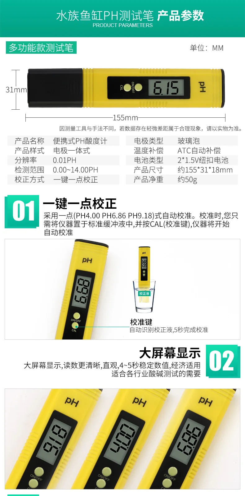 Опишите thpH метр тестер качества воды для бытовой воды, бассейнов, аквариумов, гидропоники, домашнего пивоварения, измерения pH для pH 0-14,0 Продукт Особенности Для этого тестера PH он не включает в себя калибровочную жидкость, которая может быть неточной, для обеспечения точности этого товара, пожалуйста, сделайте калибровку, когда вы получите посылку. Описание продукта: 100% Фирменная Новинка! Вес: 51 г Отличный измеритель, очень точный и прочный Диапазон измерения pH: 0,0-14,0 pH Разрешение: 0,1 pH Точность: ±0. 1 pH (20 °C), ±0. 2 pH Компенсация температуры: 0-50 °C (32-122 °F). Калибровка: ручная, 1 точка Батарея: AG 13 батарейки таблеточного типа (в комплект не входят) Примечание: этот товар поставляется без розничной коробки Этот цифровой рН-метр в стиле ручки является идеальным инструментом для аквариума, рыбной промышленности, бассейна, школьная лаборатория, продуктов питания и напитков и т. Д. Перед использованием откалибруйте буферное решение. Калибровки Вы можете просто следуйте инструкциям на предоставленном пакете решения 4.00or 6,86, погрузите тестер PH в решение и отрегулируйте с помощью предоставленной отвертки, чтобы набрать его. Управление 1. Снимите защитную крышку. 2. Сначала очистите электрод дистиллированной водой, и отсосите его фильтровальной бумагой. 3. Включите PH выключателем «ВКЛ-ВЫКЛ», расположенным на верхней части корпуса аккумулятора. 4. Погрузите электрод рН-метра в раствор до уровня погружения. Ни при каких обстоятельствах не погружайте выше уровень дисплея. 5. Осторожно перемешать и ждать, пока чтение стабилизируется. 6. После использования выключите PH, используйте дистиллированную воду, очистите электрод и замените защитную крышку. Посылка включения 1) 1 х измеритель pH 2) 1 х Отвертка 3) 2 мешки калибровочного буферного решения (4,0 и 6,86) 4) 1 руководство по эксплуатации (на английском языке) Обратите внимание Будьте осторожны со стеклянным зондом, так как он может быть немного ломким при использовании. Не забудьте аккуратно протереть ее чистой мягкой тканью, когда вы закончите, прежде чем снова укупорить ее. Е. Детали выше точки продажи, привлекая и предоставляя доверие вашим клиентам.