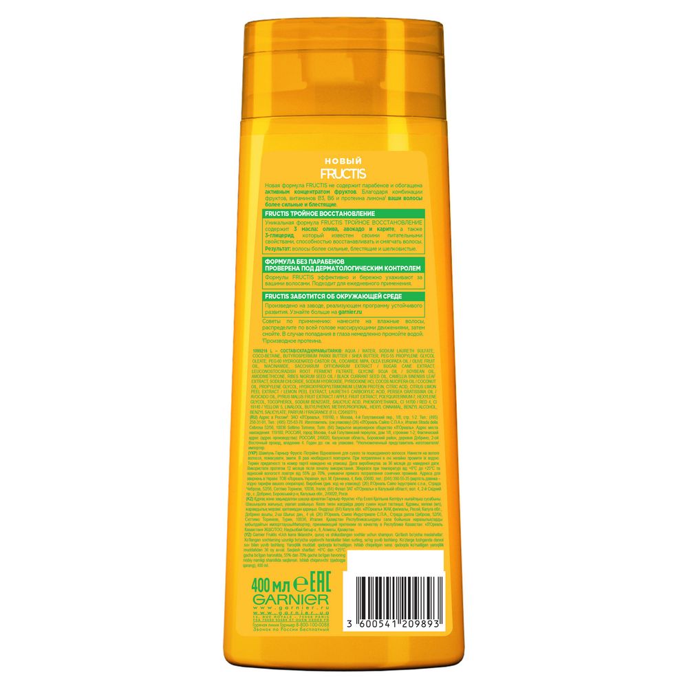 Garnier Fructis Шампунь для волос "Фруктис, Тройное Восстановление", укрепляющий, для поврежденных и ослабленных волос, 400 мл, с маслами Оливы, Авокадо и Карите