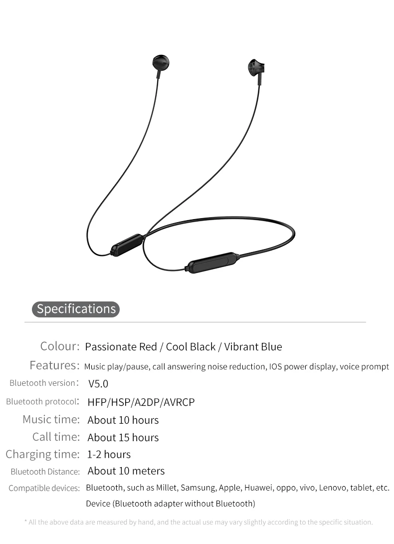 Беспроводные наушники, Bluetooth, наушники, Callable, стерео, для вождения, спортивные, водонепроницаемые, длинные, в режиме ожидания, наушники для всех смартфонов с bluetooth Гарнитура параметры: Беспроводная версия: V5.0 + EDR Напряжение при зарядке: DC5V Беспроводной частота: 30-30KGHZ Емкость аккумулятора: 200 мА · ч Рабочая температура:-10-50 ℃ Чувствительность микрофона:-40 дБ Расстояние передачи: about10M Время звучания: около 5 часов Время зарядки: около 1,5 часов Время работы в режиме ожидания: 200 часов Вес: 15 г Посылка включает в себя: 1 x наушники Bluetooth 1 x кабель для зарядки Руководство пользователя (1 шт.)