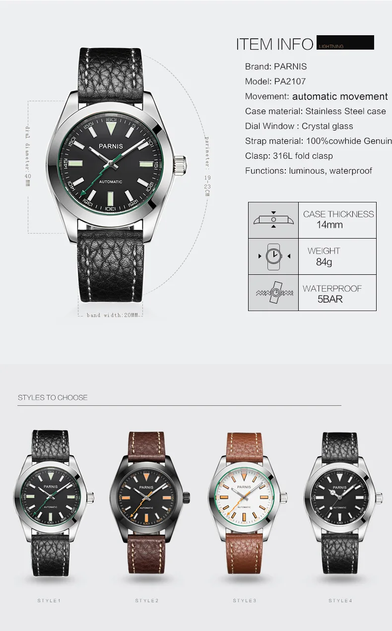 Обратите внимание, что зеленый ремешок временно отсутствует на складе, вы можете купить черный ремешок или коричневый ремешок! Диаметр циферблата: 40 мм Ширина ремешка: 20 мм Длина ремешка: 24 см Механизм: Japan Miyota 8215 Материал зеркала: сапфировое стекло Материал корпуса: нержавеющая сталь