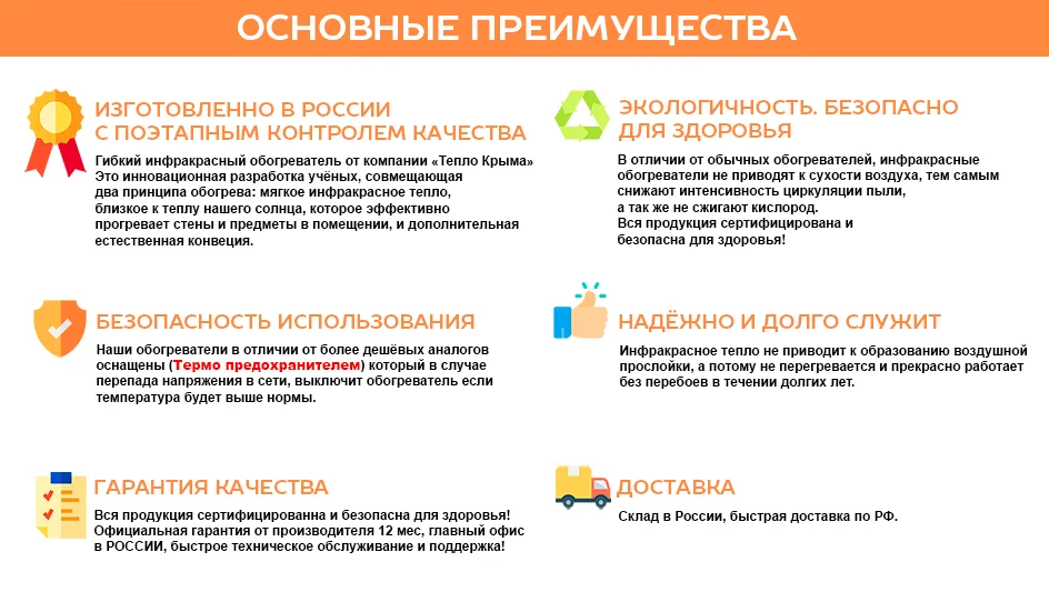 В отличии от обычных обогревателей, инфракрасные обогреватели не приводят к сухости воздуха, тем самым, снижают интенсивность циркуляции пыли, а так же не сжигают кислород. Инфракрасное тепло не приводит к образованию воздушной прослойки, а потому не перегревается и прекрасно работает без перебоев в течении долгих лет. Обогреватель имеет II класс защиты от поражения эл током, класс защиты оболочки IP 20, что гарантирует надежность и безопасность использования обогревателя.