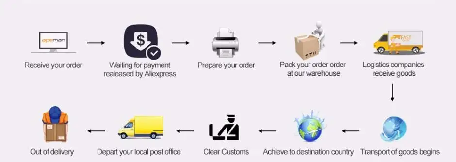 . Заказы будут обработаны в срок после подтверждения оплаты. . Мы отправляем товары только по адресу заказа, поэтому, пожалуйста, подтвердите правильность адреса вашего заказа и контактной информации. . Если вы хотите получить товар срочно, вы можете выбрать DHL или FedEx, но вам нужно оплатить стоимость доставки. . Время доставки: как правило, срок доставки посылки составляет 15-35 дней, из-за уровня развития логистики и эффективности таможни в каждой стране, . Если вы не получили посылка в течение обещанного времени, пожалуйста, сообщите нам, и мы поможем вам вовремя.