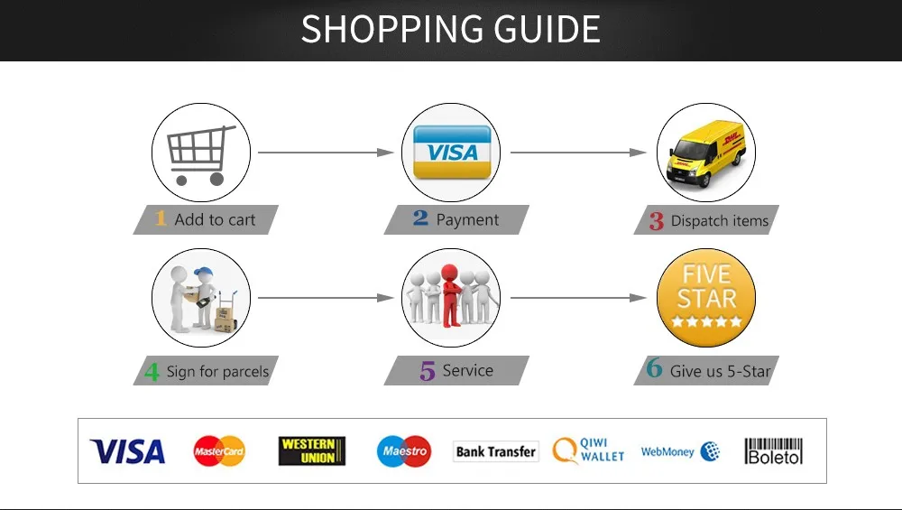 Мы осуществляем доставку по всему миру через стандартную почтовую службу Aliexpress methord, почту Сингапура, DHL и т. д. Все товары есть в наличии, пожалуйста, не стесняйтесь покупать любой товар. Все заказы обрабатываются в течение 48 часов после подтверждения оплаты. Пакеты отправляются в течение 2-4 рабочих дней после подтверждения оплаты. Информация об отслеживании посылок, отправленная почтой Китая/Сингапура, обычно отображается в течение 3-5 рабочих дней. Если вы не получили посылку в течение 30 дней после оплаты, пожалуйста, свяжитесь с нами. Мы Отследим доставку и ответим вам как можно скорее. Гарантийное обслуживание 12-месячная гарантия на техническое обслуживание, 30-дневная гарантия на возврат или замену. Мы стремимся к 100% удовлетворенности клиентов, если вы испытываете какие-либо проблемы с продуктом, пожалуйста, не стесняйтесь связаться с нами, мы найдем решение как можно скорее. Возврат/возврат Все наши товары являются 100% новыми и оригинальными, поставляются с гарантией на один год, пожалуйста, свяжитесь с нами, если вы не удовлетворены покупкой. Для нас большая честь поставлять лучшие продукты и предоставлять вам высококачественное обслуживание. Вы можете связаться с нами в течение 7 дней, после того как вы получили продукт; Мы заверяем вас, что мы дадим ответ на претензию в течение 30 дней, если вы испытываете какие-либо проблемы с нашим продуктом. Ответственность за доставку любых возвращенных товаров лежит на покупателях. Для обработки ваших требований может потребоваться до 7 рабочих дней, после того как мы получим товар. Мы оплатим возврат средств, если товар не был получен в течение гарантированного времени доставки или был сломан во время доставки. Если ваш заказ был закрыт AliExpress по потенциальным причинам безопасности. Все сделанные платежи (за исключением сборов и сборов, произведенных для третьих лиц) будут возвращены на ваш счет.