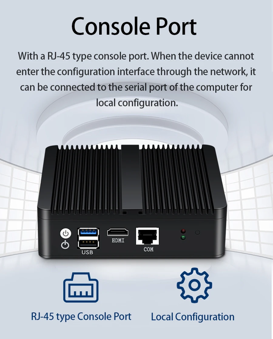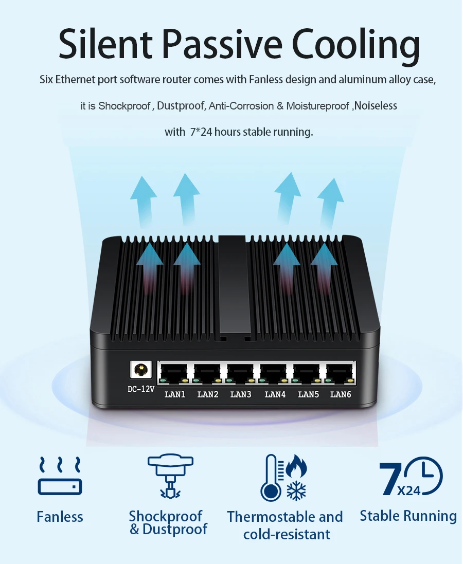 -Процессор Intel Celeron J1900 процессоров, четырёхъядерники, 2,0 ГГц, до 2,42 ГГц; -Совместимость с памятью 1,35 в DDR3L 1066/1333/1600 МГц, максимальная поддержка до 8 Гб; -Supprot 1x mSATA SSD и 1x SATA 2,5 дюймов HDD/SSD; -Интерфейсов С 6x LAN Intel 211AT 10/100/1000 Мбит/с, 1x USB 3,0, 1x USB 2,0, 1x HDMI, 1x COM ( RJ45 для RS232 консоль); -ОС поддерживает Windows 7/8/10, Linux, Ubuntu, CentOS, LEDE, Pfsense, SohpOS, ESXI6.7 и многое другое; -Поддержка пробуждения по локальной сети, виртуализации, автоматическое включение после восстановления питания. -Поддержка Mini PCIE для WiFi / 2G 3G 4G модуля, с слотом для sim-карты. -Безвентиляторное пассивное охлаждение, алюминиевый чехол. -Может быть настроен как брандмауэр, LAN/WAN маршрутизатор, vpn-устройство, DHCP/DNS сервер.