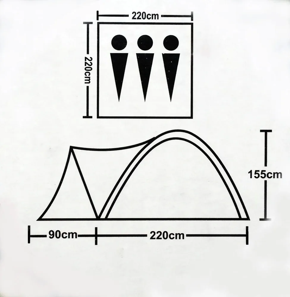 РАЗМЕР: Д(220+190) * Ш220 * В155 ТКАНЬ ТЕНТА: 190Т POLYESTER PU 3000MM B/Н ТКАНЬ ПАЛАТКИ: 180Т POLYESTER ДЫШАЩАЯ ТКАНЬ ПОЛА: 150D OXFORD PU 2000 MM B/Н ДУГИ: FIBERGLASS 8,5 мм * 3 шт