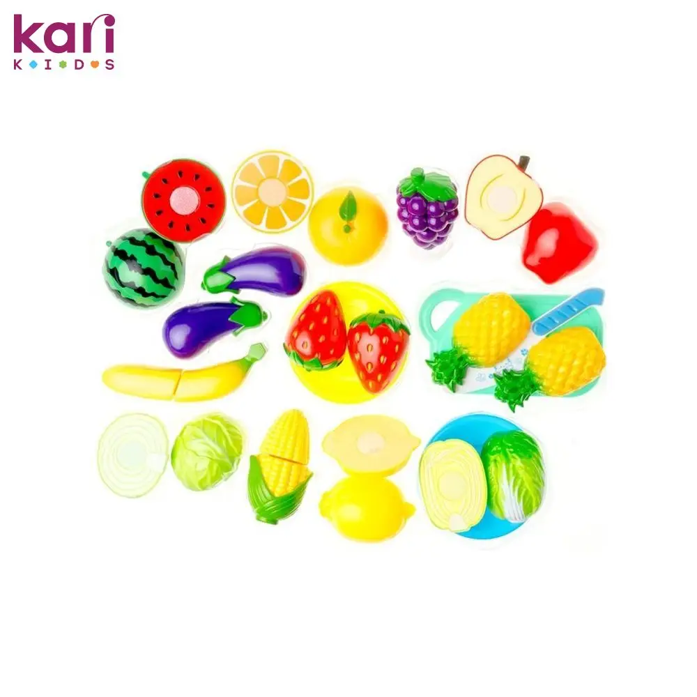 Набор продуктов марки kari KIDS состоит из нескольких фруктов и овощей, а также ягод, разделочной доски с ножом и сервировочной тарелки. Все продукты имеют надрез, что позволяет с помощью предложенного ножа удобно разделить их на две половины. Все элементы набора изготовлены из прочного яркого пластика. Такая игрушка способствует развитию у ребенка мелкой моторики. Возрастные ограничения 3+.