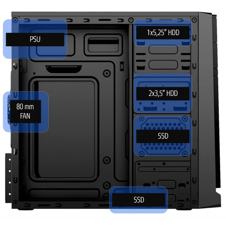 Возможность установить до четырёх 2.5" и 3.5" SDD- и HDD-накопителей, плюс отсек для внешнего 5.25"-устройства.