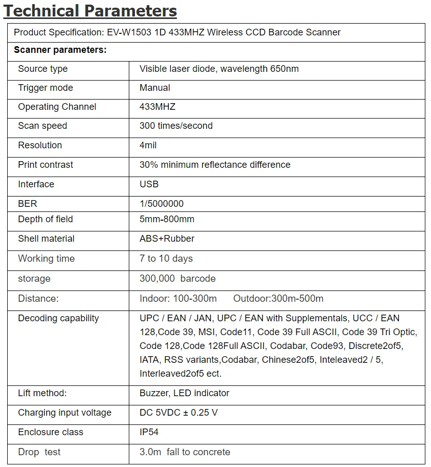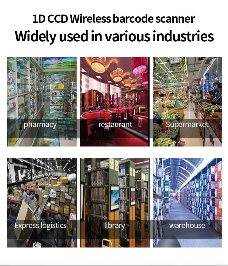 Особенности: 1. Подключи и работай, не нужно устанавливать какие-либо процедуры. 2. Может хранить 300000 штрих-кодов в автономном режиме. 3. 433 МГц Беспроводная связь расстояние открытый 500 м, крытый 200 м. 4. База поддерживает передачу данных и зарядку аккумулятора. 5. Автоматическая скачка частоты и сильная способность анти-помех. 6. Полный quakeproof дизайн, выдерживают 1,5 м капель. 7. Области применения: супермаркет, розничная торговля, склад, логистика, библиотека, медицина и т. Д. 8. Может быть настроен в соответствии с требованиями заказчика.