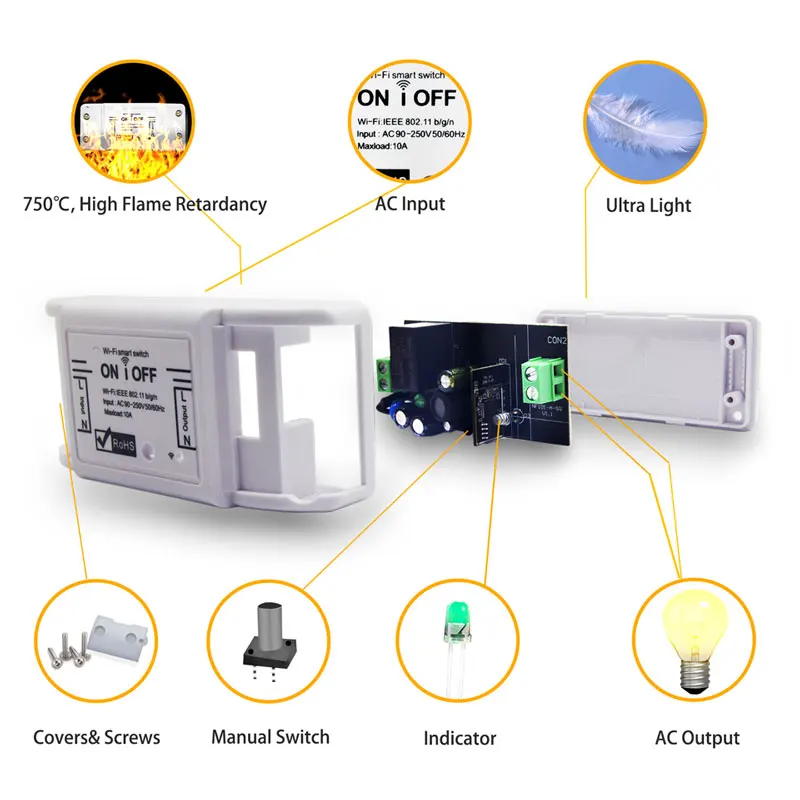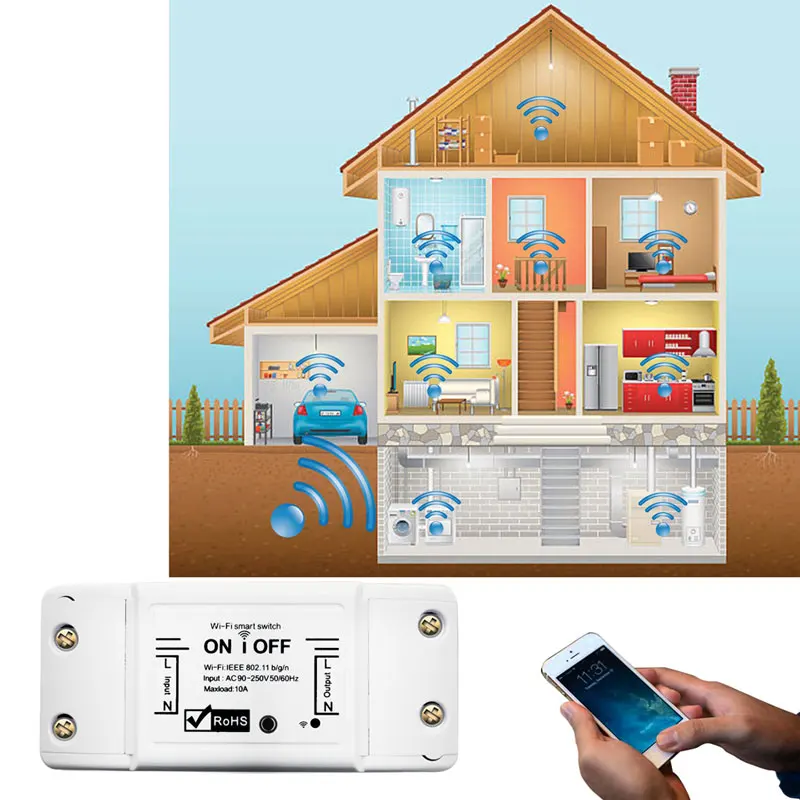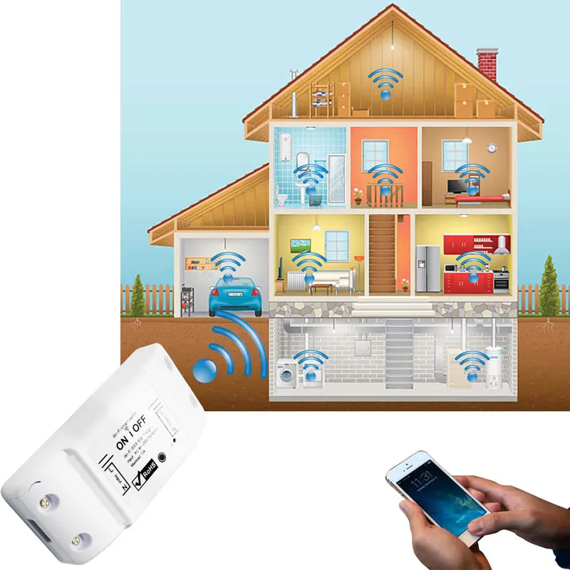Этот Wi-Fi коммутатор может подключаться к Интернету через беспроводную сеть Wi-Fi 2,4G. Независимо от того, где вы находитесь, если есть сеть, вы можете управлять статусом вкл/выкл устройства через приложение для смартфона, например, вентиляторы, фонари, водонагреватели и фонтан, И т. д. После подключения Amazon Alexa или Google Assistant, мы можем использовать голос для управления смарт-переключателем. Переключатель имеет функцию таймера, функцию назначения.