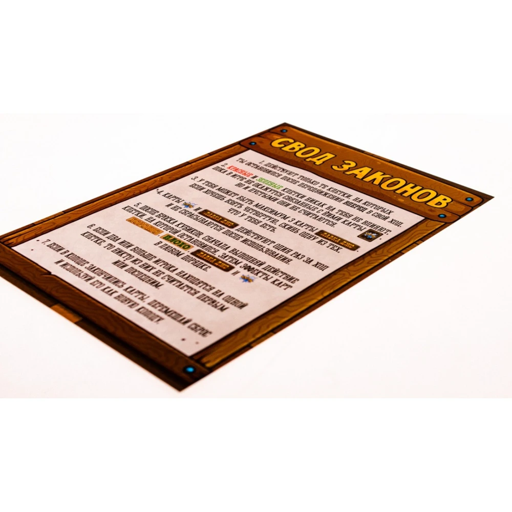 | Комплектация | Игровое поле 59 карт 90 жетонов монет 5 персонажей 5 подставок под персонажей 2 кубика Свод законов |