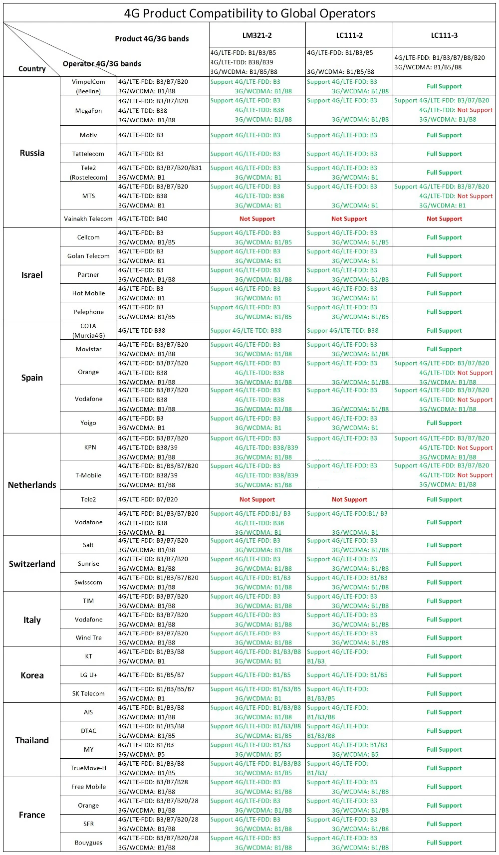 4G LTE FDD B1/B3/B5/B8,
