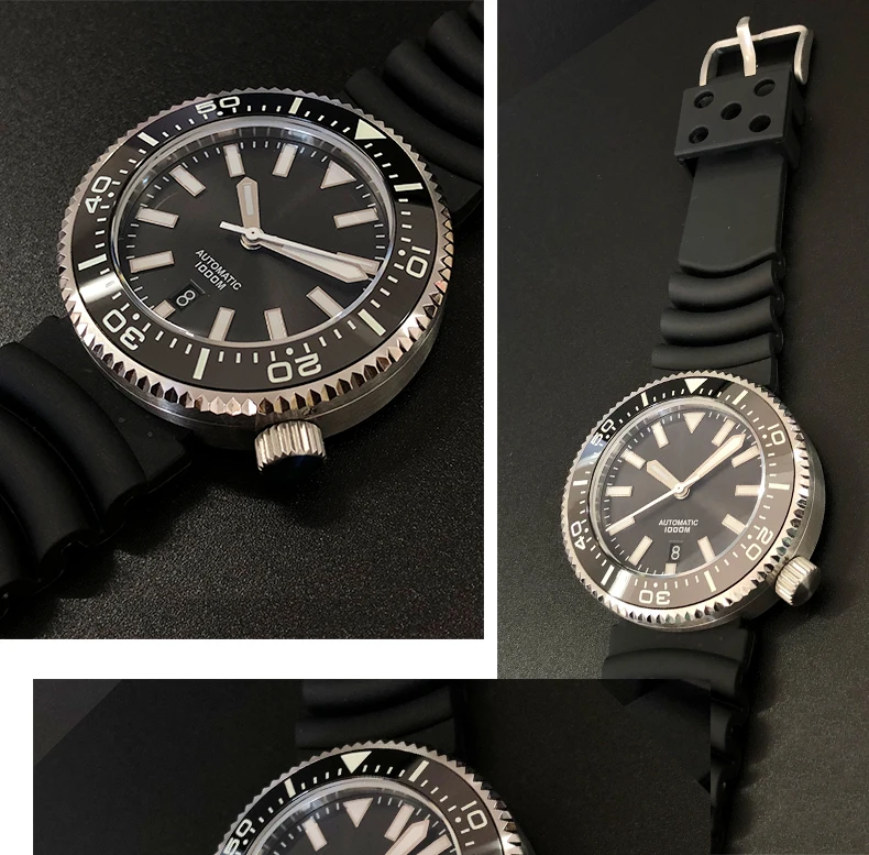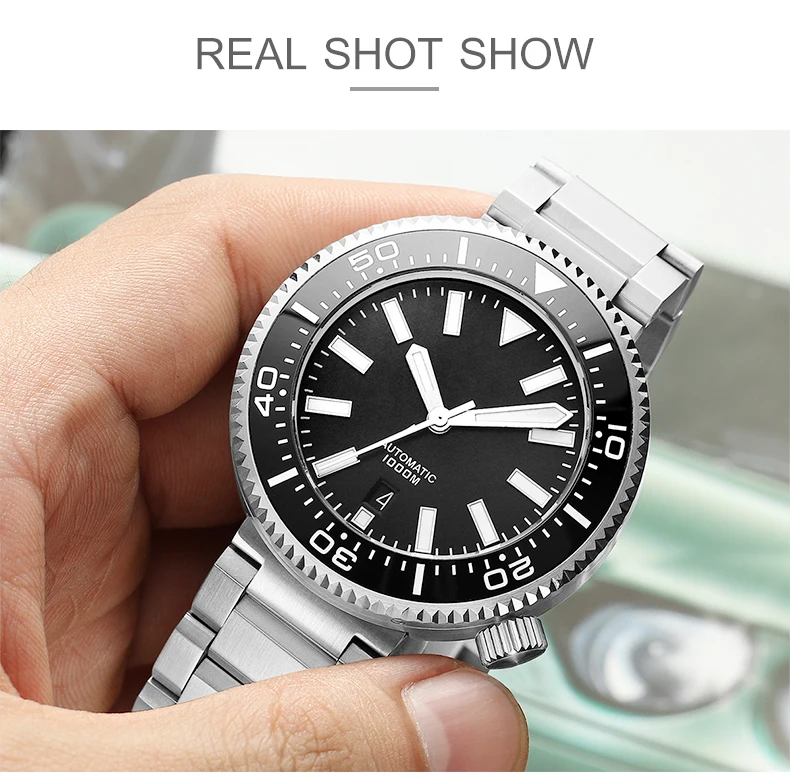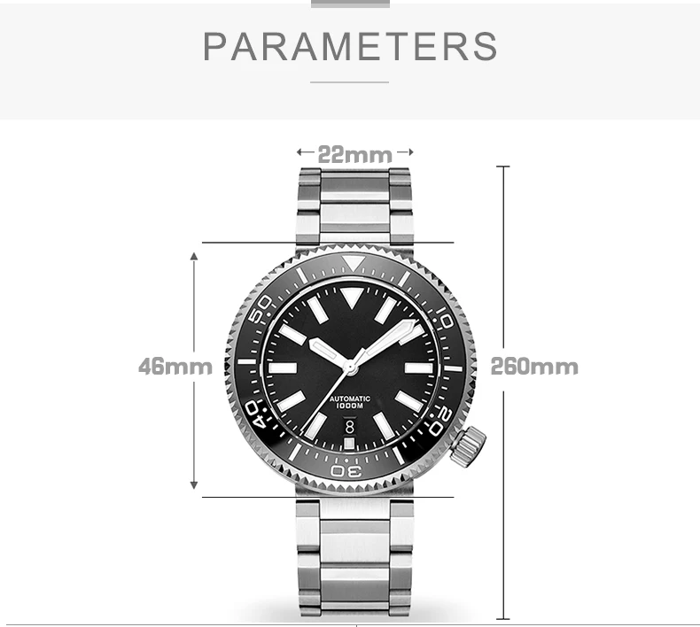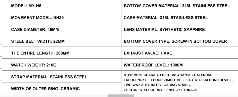Тип движения: автоматическое механическое движение Модель движения: Япония NH35 Характеристики движения: 3 стрелки/календарь, частота 21600 раз в час (3 Гц), Устройство остановки, двухсторонняя Автоматическая обмотка, 24 камня, 41 час хранения энергии. Чехол Материал: 316L нержавеющая сталь Чехол: матовый Материал нижней крышки: нержавеющая сталь 316L Тип нижней крышки: Винтовая Нижняя крышка Чехол диаметр: 46 мм (за исключением бар) Чехол длина: 46 мм (общая длина сверху и снизу) Чехол Толщина: 13,8 мм (в том числе зеркало и нижняя крышка) Чехол-ушанка: 22 мм (где соединен чехол и ремешок) Вес головы: 106 г (без ремешка) Вес всего стола: 210 г (с силиконовым стальным ремешком) Длина Часов: 260 мм (общая длина часов/периметр) Материал ремешка: нержавеющая сталь Материал стола: Синтетический сапфир Тип зеркала: двойной сапфир Зеркальное покрытие: Антибликовое голубое покрытие Размер зеркала: 32,5*3,6 мм (диаметр * толщина) Тип головки: винтовой замок Размер головки: 7,5 мм (диаметр) Материал ободка: керамика Особенности ободка: вращение кольца на 120 зубьев Безель Светящийся: 240000/кг Швейцарский BGW + C3 Супер светящийся порошок, сине-зеленый светильник Размер ободка: 41,8*32,7*2,2 мм (толщина * внутренний диаметр * толщина) Цвет поверхности: Азиатский черный, супер светящийся Поверхностный свет: 240000/кг Швейцарский C3 Супер светящийся порошок, зеленый светильник Размер поверхности: 32,8*32,5*31,5*0,4 мм (шелковое отверстие * диаметр поверхности * открытая поверхность * толщина) Ремесло указателя: Потяните за иглу Световой указатель: 240000/кг Швейцарский C3 Супер светящийся порошок, зеленый светильник Ручной Размер: 9*14,5*14,5 мм (часовая стрелка • минутная стрелка * длина минутной стрелки) Водонепроницаемость: 1000 метров водонепроницаемый/Дайвинг Выпускной клапан: Да Гарантийный срок: три года бесплатной гарантии Стандарт упаковки: профессиональная Водонепроницаемая пластиковая упаковка