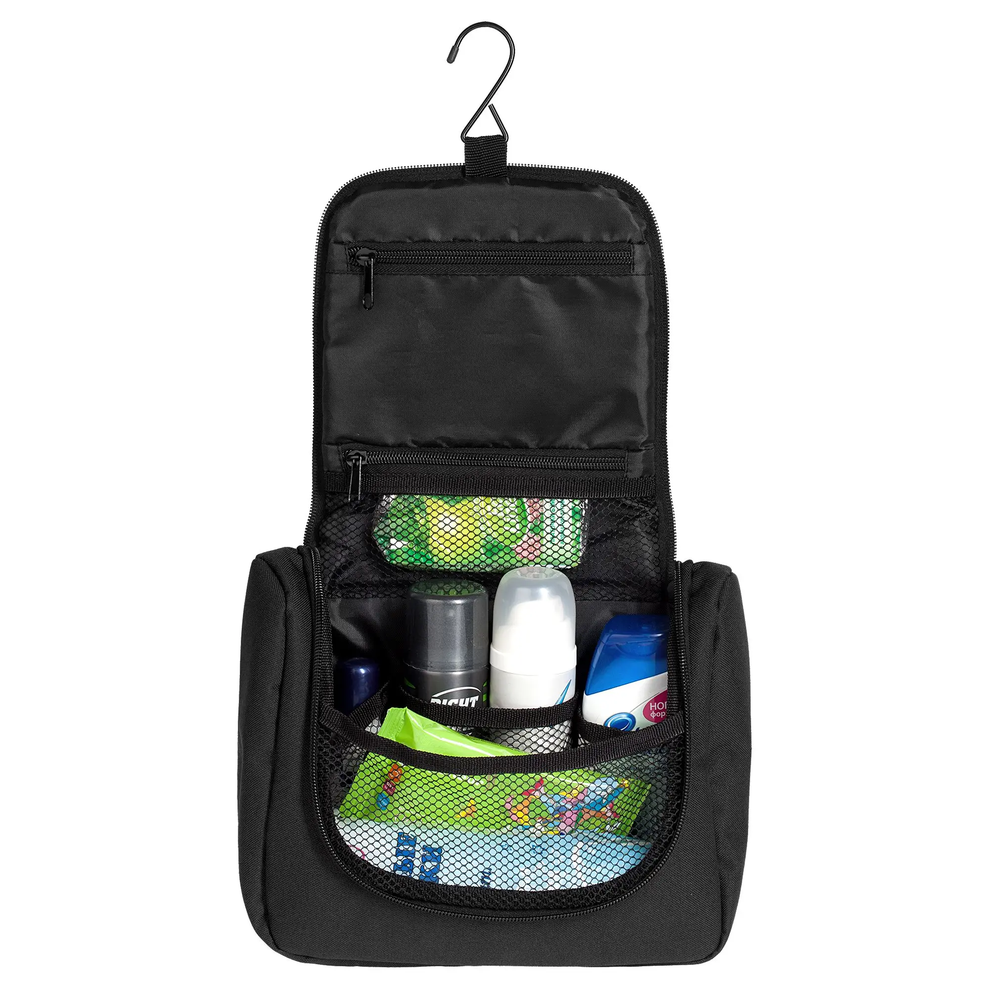 Большое главное отделение на молнии Два внутренних кармана на молнии Три внутренних кармана из сетки Наружный карман на молнии Крючок для подвешивания РАЗМЕРЫ 25х20х8 см МАТЕРИАЛ полиэстер, 600D