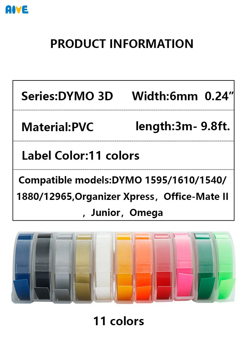 5 шт. 6 мм Dymo 3D пластиковая лента с тиснением для тиснения этикеток производитель ПВХ этикеток ленты DYMO 1540 1595 12965 Motex Омега Органайзер