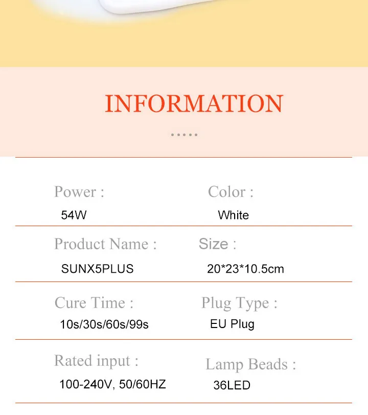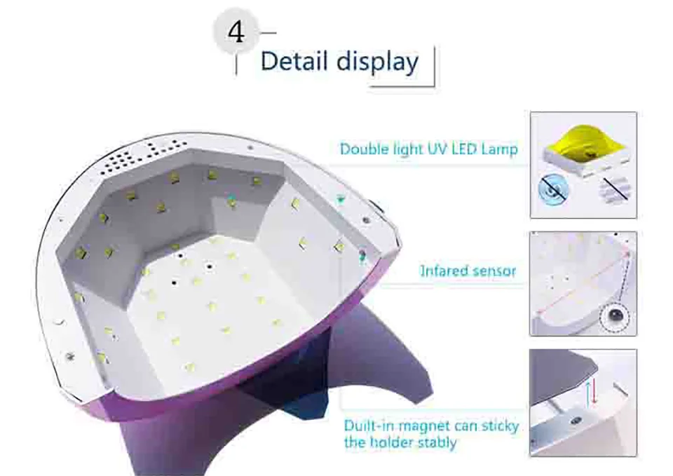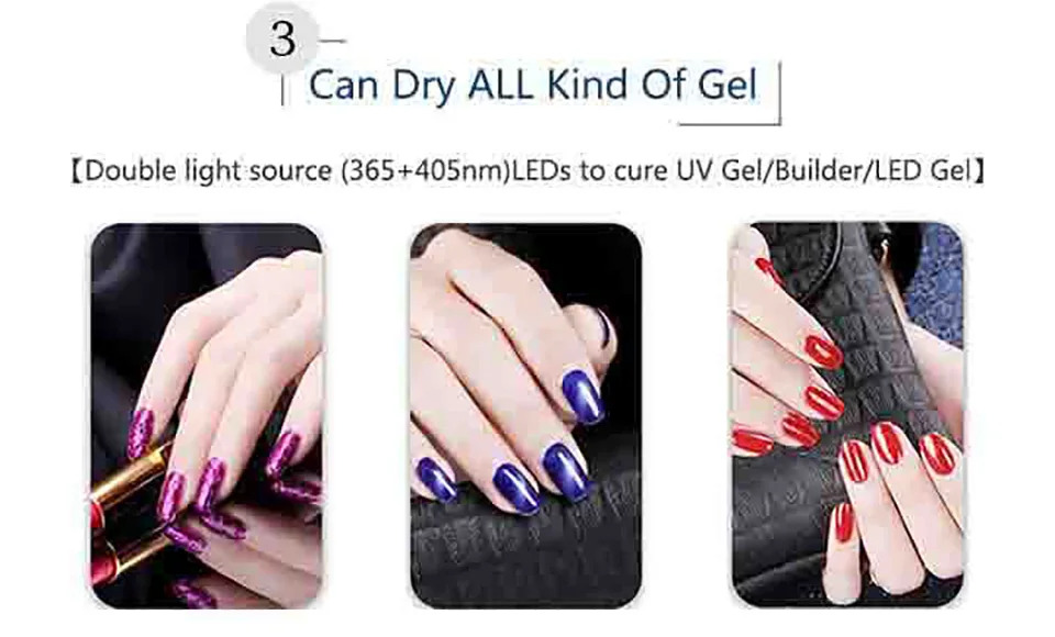 Характеристики: Тип: лампа для ногтей Материал: АБС-пластик Цвет: белый Тип вилки: штепсельная вилка европейского стандарта Мощность: 54 Вт Бусины: 36 светодиодов Стиль изделия: Сушилка для ногтей Функция: УФ-гель отверждения света Тип товара: оборудование для дизайна ногтей Особенности: 1) может высушить почти все гели для ногтей: Используется для лечения различных гелей для ногтей, таких как УФ-строитель ногтей и базовые гели. 2) Автоматическая индукция: Он начнет работать автоматически, если вы положите руки в эту машину без нажатия кнопки времени. 3) четыре вида настройки времени: 10 секунд, 30 секунд и 60 секунд для выбора времени и 99 секунд для максимального рабочего времени без нажатия кнопки времени. 4) режим низкого нагрева: 99 секунд для режима низкого нагрева, защищая кожу ваших рук. 5) отсчет и Функция удержания времени: Он будет отсчитываться, если вы нажмете кнопку настройки времени. Функция хронометража начинается, если вы выбираете режим низкого нагрева или автоматический индукционный режим. Посылка: Лампа для ногтей * 1 Штепсельная Вилка европейского стандарта * 1 Руководство пользователя * 1 Оригинальная коробка * 1