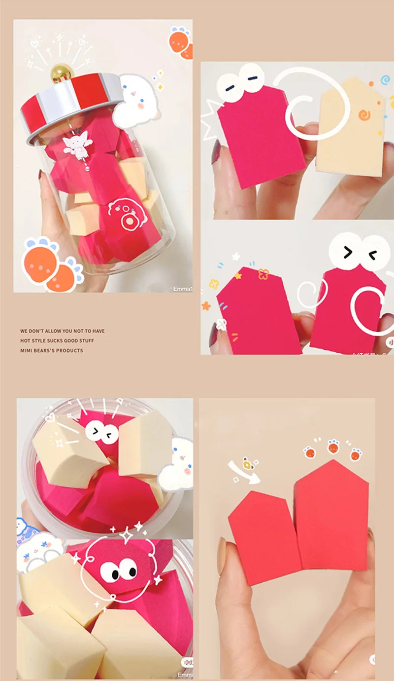 1) Высокая устойчивость без деформации 2) поглощение воды 3) можно использовать во влажной и сухой косметике 4) пентагональный крой, полностью подходит для вашего лица, придает вам более совершенный макияж. 5) патент новый дизайн для покупателя