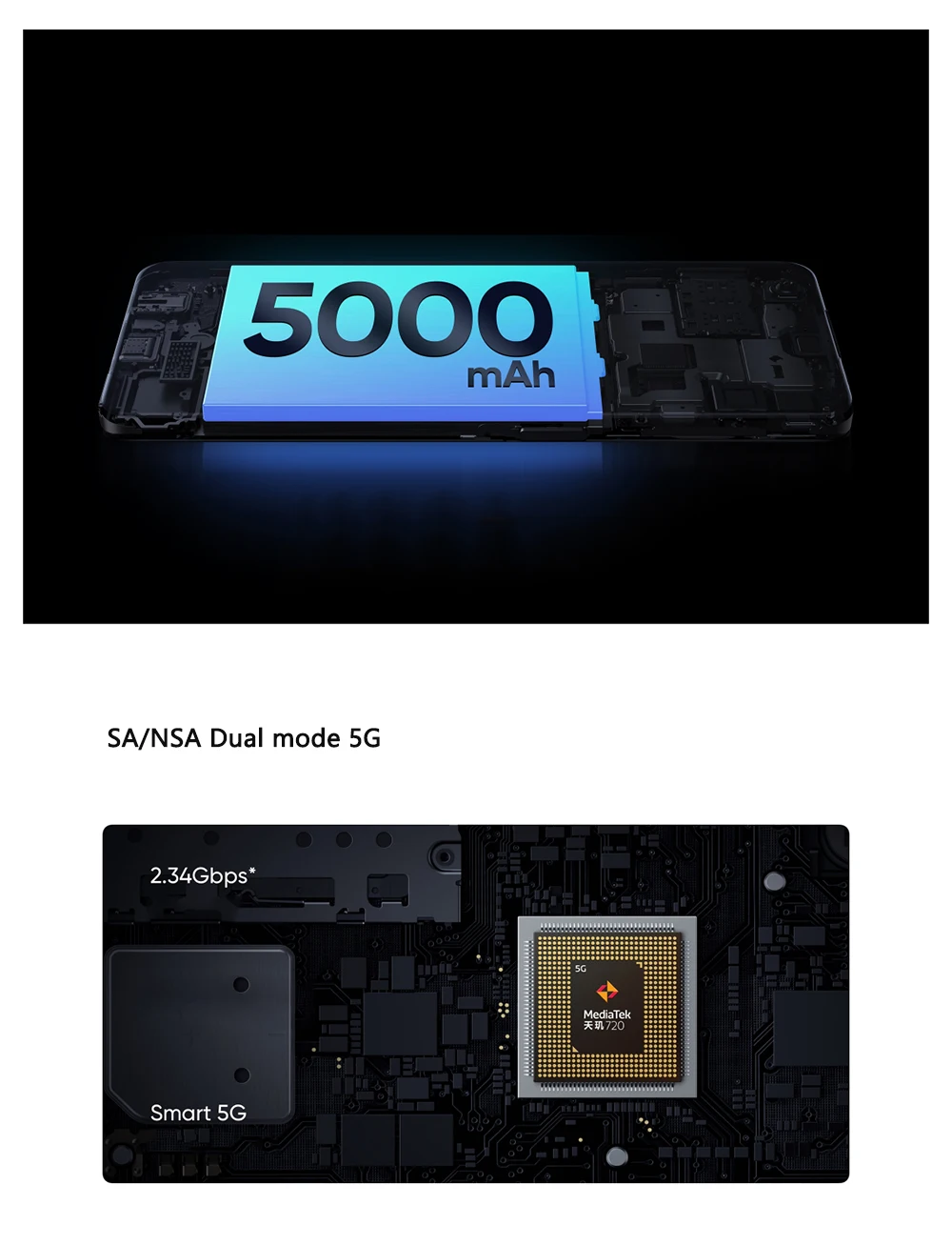 Модель REalme V5 ЦП Размеры 720 Графический процессор ARM G57 MC3 Дисплей 6,5 дюйма +2400*1080 Камера Передняя часть 16 Мп,Задний (48MP + 8MP + 2MP + 2MP) Аккумулятор 4900 мАч (typ)-5000 мАч, 3Мощность зарядки 0 Вт ОС Пользовательский интерфейс realme на базе Android 10,0 Слот для карты Две nano-SIM Прочее Сеть 5G NR:NSA: N41(2515-2675 МГц)/N77/N78/N79; SA: N1/N41(2515-2675 МГц)/N78/N79