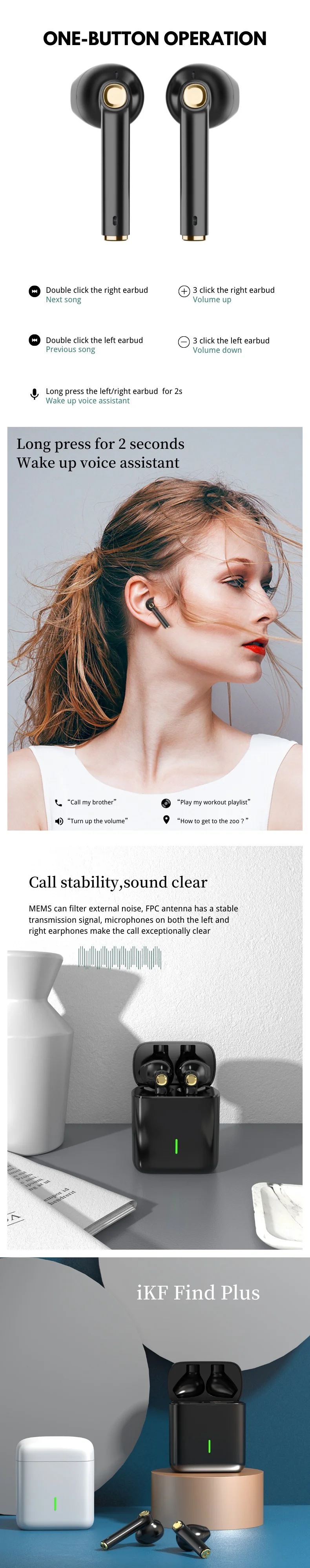 [Открыть коробку самосопряжения]-когда вы впервые откроете чехол для зарядки, откройте мобильный телефон Bluetooth и найдите «iKF Find Plus» и нажмите «подключить». После успешного сопряжения, в следующий раз, когда вы откроете коробку, она сопряжена автоматически. [Управление одной кнопкой]-эта bluetooth-гарнитура может регулировать громкость или воспроизведение, а также звонить Siri или другим интеллектуальным голосовым помощникам с помощью одной кнопки. [Удобная одежда]-эта bluetooth-гарнитура имеет полувстроенный дизайн и весит светильник для более комфортного ношения. [Длительное время работы от аккумулятора]-это беспроводные наушники обеспечивают защиту от может работать в течение более 4-5 часов непрерывной работы от одного заряда и 20 дополнительных часов с зарядкой чехол. Чехол для зарядки даже поддерживает беспроводную зарядку. [Стереозвук]-эти Беспроводные Наушники обладают действительно естественным, АУТЕНТИЧНЫМ ЗВУКОМ и мощным басом с блоком динамиков 10 мм. [Bluetooth 5,0 и Высокая совместимость]-эти беспроводные наушники используют самую передовую технологию Bluetooth 5,0, поддерживает HSP/HFP/A2DP/AVRCP. Также имеет быструю и стабильную передачу без запутывания.