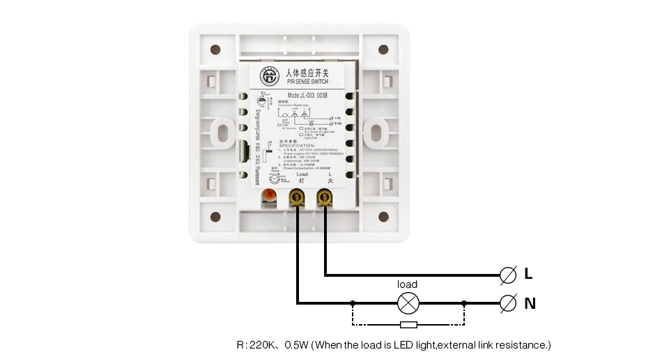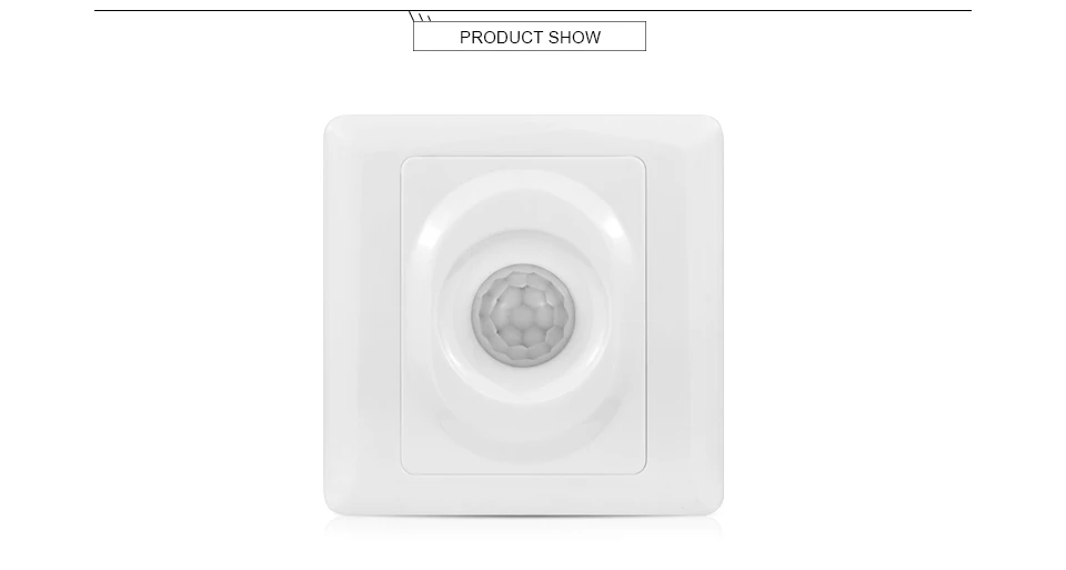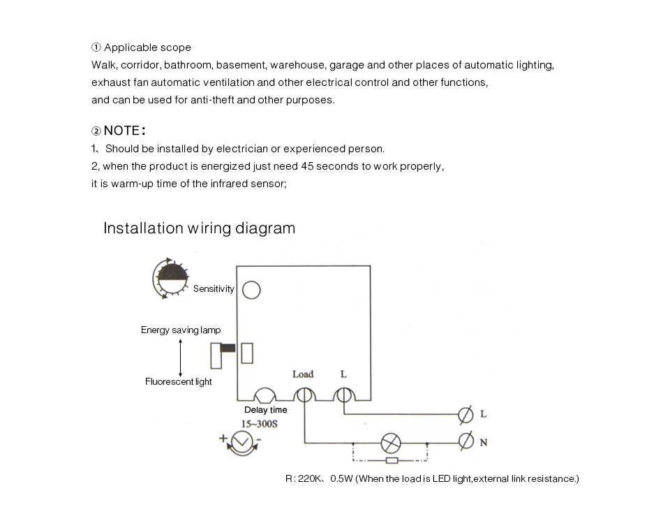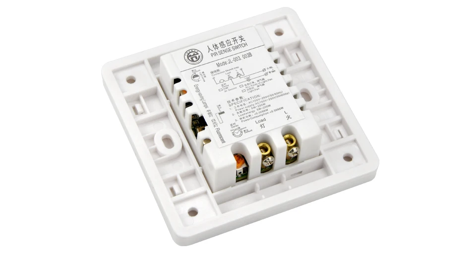 Параметры: Рабочая Мощность: AC100V ~ 250 В пер. тока, 50/60 Гц Мощность нагрузки: LED≤ 40 Вт, энергия Saving≤ 80 Вт, Incandescent≤ 200 Вт, Fan≤ 50 Вт Потребляемая мощность в режиме ожидания 0,0088 W Освещение: 5LUX ~ 5000LUX Время задержки: 15-300 сек (по умолчанию 20 сек) Расстояние датчика: 6 ~ 10 м Угол датчика: 110 ~ 140 градусов Применение: корридо, туалет, подвал, склад, гараж и другие места автоматического освещения, конвульсии вытяжного вентилятора и другие автоматические электрические управления, используется для обеспечения безопасности одновременно. Внимание: 1. Чтобы выключить питание при установке, должен быть установлен профессионалом 2. Этот переключатель может работать нормально через 45 секунд, когда электричество, это инфракрасный датчик предварительного нагрева 3. Не перегружать