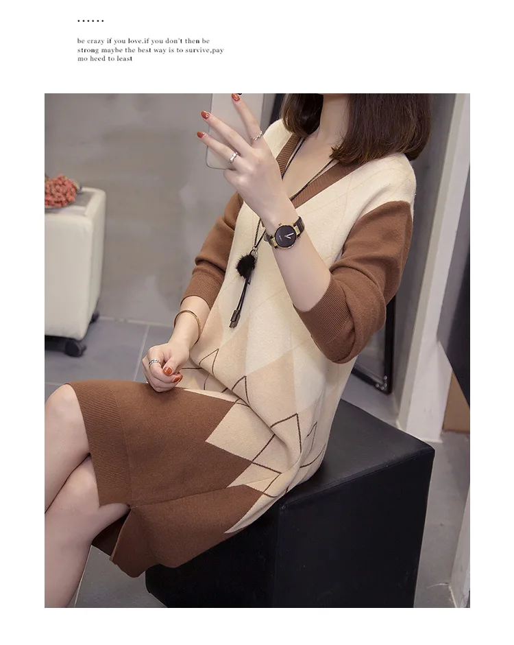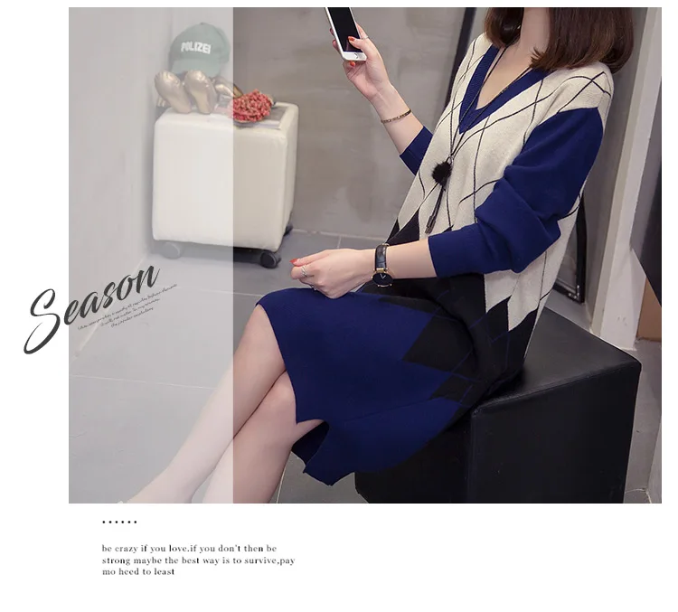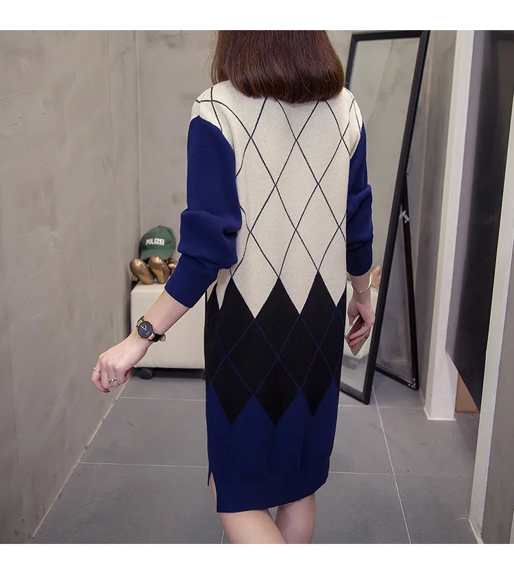 Эстетическое вязаный свитер с ромбами платье для женщин осень зима корейские