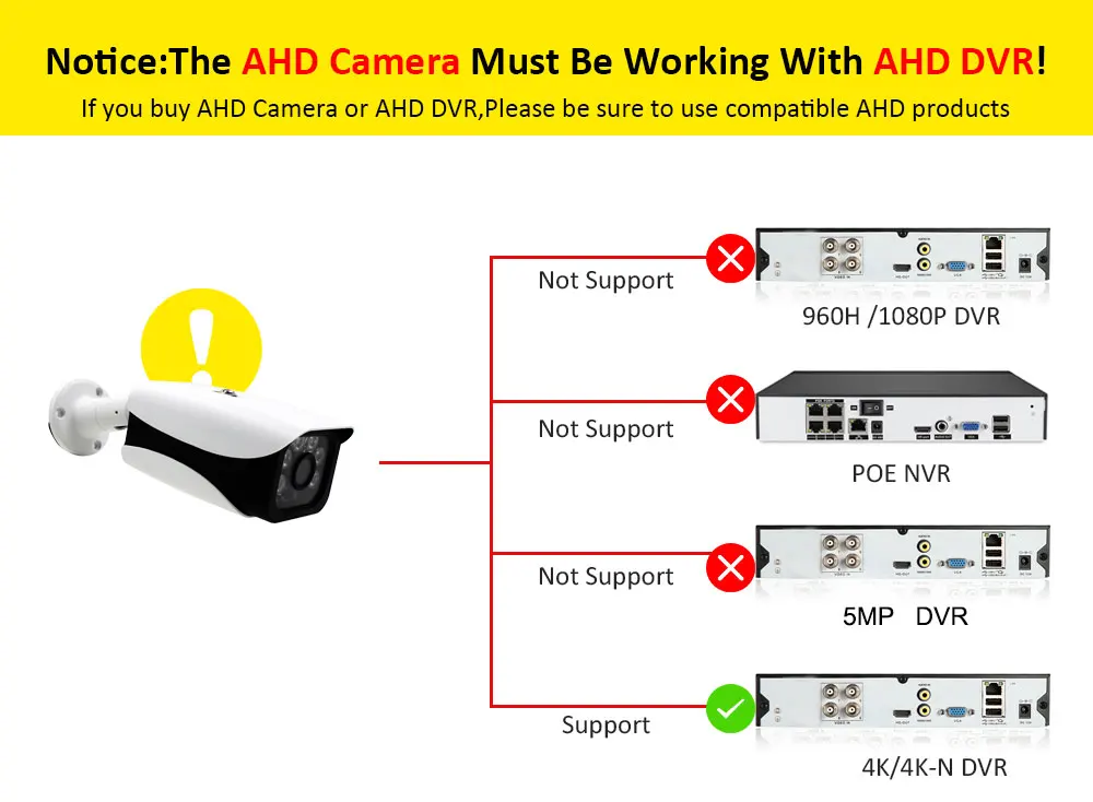 1.HD 8 Мп AHD камера работает только с 4K AHD DVR или 4K-N AHD DVR или 4K AHD DVR! Пожалуйста, убедитесь, что ваш AHD DVR поддерживает 8 Мп hd камеру перед покупкой!