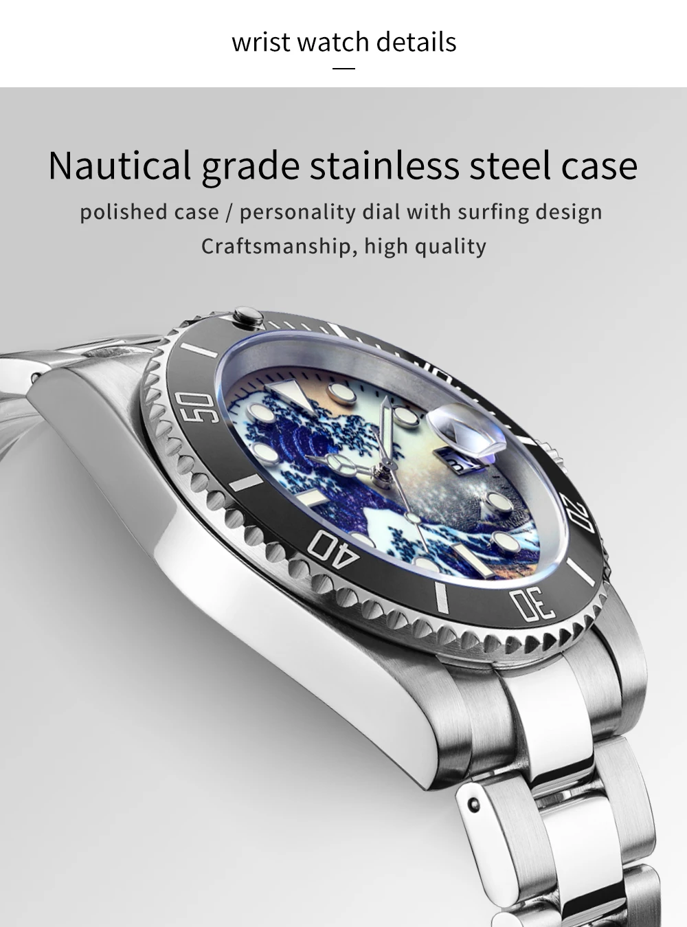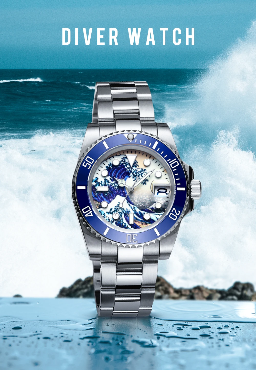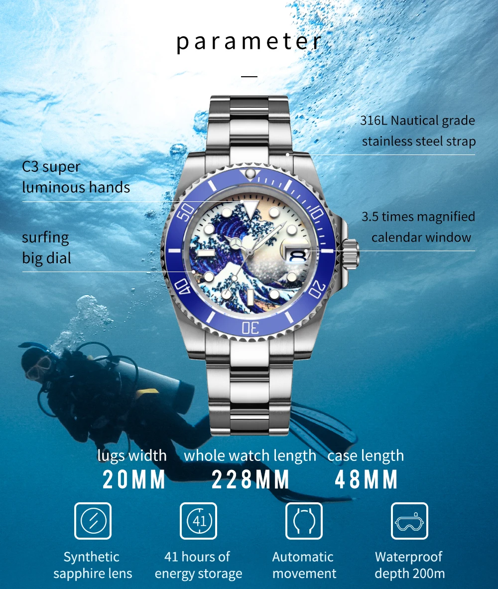 "The Great Wave of Kanawaga"-это красочный Ukiyo-e принт, созданный японским художником катсушикой хокусаем в начале 19-го века. Морские волны возле канагавского моря великолепны и расширяются. Есть три наступающих корабля под волнами. Для того, чтобы быть в живых, отважные бойцы воюют с большими волнами. Чтобы воздать дань Бесстрашному духу героических бойцов канагавы, ADDISDIVE запустил эту серию серфинга дизайна циферблата. Особенности этой серии имеют прочные и красивые линии, отличный дизайн волн и водонепроницаемость до 200 м.