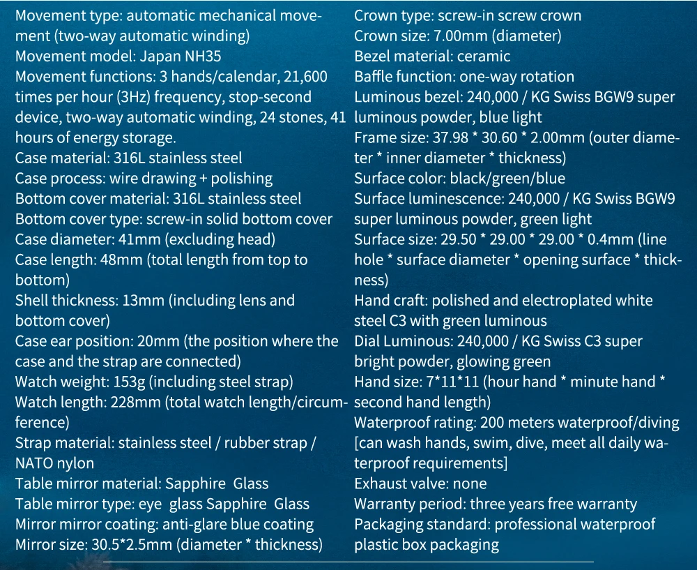 Тип механизма: автоматический механический механизм (двухсторонняя Автоматическая обмотка) Модель движения: Япония NH35 Функции движения: 3 стрелки/календарь, 21600 раз в час (3 Гц) частота, секундомер устройства, двухсторонняя Автоматическая обмотка, 24 камня, 41 часа хранения энергии. Чехол Материал: 316L нержавеющая сталь Чехол: проволочный рисунок + полировка Материал нижней крышки: нержавеющая сталь 316L Тип нижней крышки: Винтовая сплошная Нижняя крышка Чехол диаметр: 41 мм (без головки) Чехол длина: 48 мм (общая длина от верха до низа) Толщина корпуса: 13 мм (включая линзу и нижнюю крышку) Чехол для ушей: 20 мм (положение, в котором подключен чехол и ремешок) Вес часов: 153 г (включая стальной ремешок) Длина Часов: 228 мм (общая длина часов/окружность) Материал ремешка: нержавеющая сталь/Резиновый Ремешок/нейлон NATO Материал зеркала для стола: стекло с сапфиром Тип зеркала для стола: стекло для глазных ягод Зеркальное зеркальное покрытие: Антибликовое голубое покрытие Зеркало Размер: 30,5*2,5 мм (диаметр * толщина) Тип короны: Винтовая головка И изображением короны, Размеры: 7,00 мм (диаметр) Материал ободка: керамика Функция перегородки: одностороннее вращение Светящийся ободок: 240000/кг Швейцарский BGW9 супер светящийся порошок, синий светильник Размер оправы: 37,98*30,60*2,00 мм (внешний диаметр * внутренний диаметр * толщина) Цвет: черный/зеленый/синий Яркость поверхности: 240000/кг Швейцарский BGW9 супер светящийся порошок, зеленый светильник Размер поверхности: 29,50*29,00*29,00*0,4 мм (линия отверстия * диаметр поверхности * открытие поверхности * толщина) Ручная работа: полированная и гальванизированная Белая сталь C3 с зеленым светом Циферблат: 240000/кг Швейцарский C3 Супер Яркий порошок, светящийся зеленый Размер руки: 7*11*11 (часовая стрелка * минутная рука * секундная длина) Водонепроницаемость: 200 метров Водонепроницаемость/дайвинг [можно мыть руки, плавать, нырять, удовлетворить все ежедневные водонепроницаемые требования] Выпускной клапан: нет Гарантийный срок: три года бесплатной гарантии Стандарт упаковки: профессиональная Водонепроницаемая пластиковая упаковка
