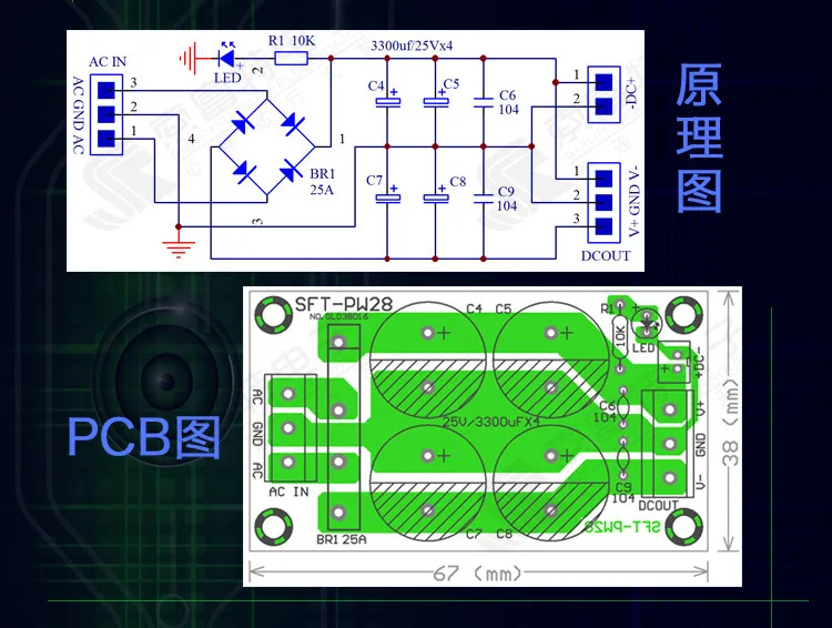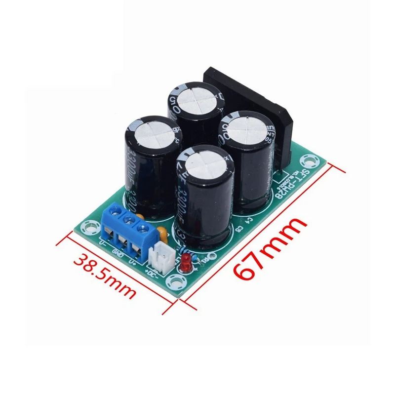 Плата фильтра выпрямителя с использованием сверхвысокого тока 25А выпрямителя моста,Двухсторонний полноволновой выпрямитель переменного тока в двойной прямой ток, с использованием четырех3300 мкФ/алюминиевая крышка, 25В большой конденсатор с алюминиевой крышкой, для того, чтобы сделать фильтрации, 104 монолитные конденсаторыДелаем развязку, эффективно подавляя беспорядок переменного тока, постоянного токаБолее чистый, как двойной усилитель мощности, используется для LM1875,TDA2030, TDA7294, LM3886 и другие низкомощные усилители. Входное напряжение: двойной AC9-17V переменного тока Выходное напряжение: Двойной DC ± 12V-24V Параметры плоского моста: 25AРазмер: 67*38*28 мм