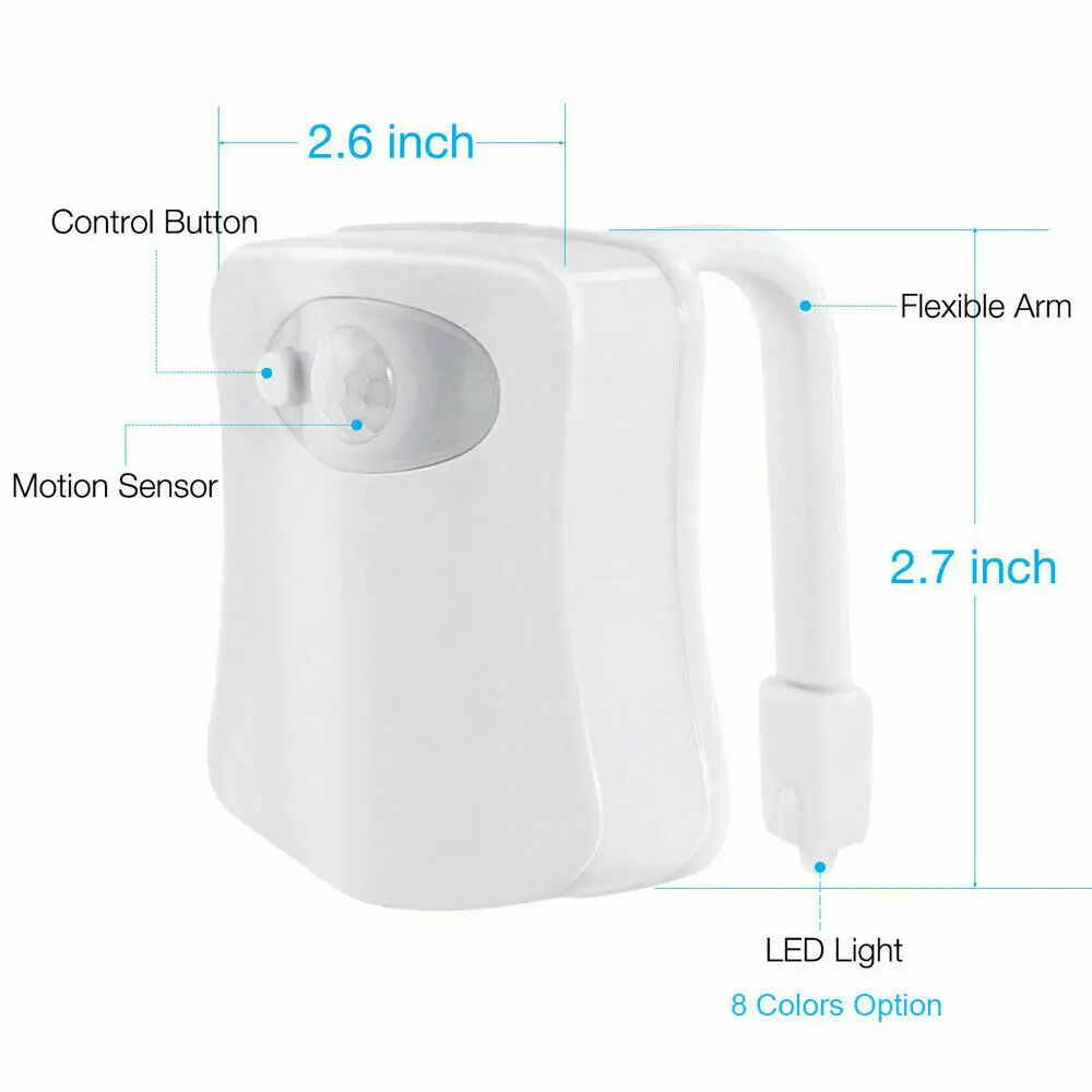 Название продукта: светодиодный ночной Светильник для туалета с датчиком движенияПродукт Размеры: 7*6,5*1,7 см (2,76*2,56 * 0.67in)Наружная коробка Размеры: 7*5*9,5 см (2,76*1,97 * 3.74in)Вес нетто: 39,5 г (1,39 унций3 * AAA батарейки в комплект не входят)Вес брутто (с коробкой): 50 г (1,76 унций)Батареи: 3 * AAA батареи (Не входит в комплект)Материал: АБС-пластик + ПоликарбонатРасстояние датчика: 2 метра/5 футовСветильник Цвет: 8 видов цветов Цвет s автоматическое изменение лунный светНапряжение: 4,5 VМощность: 0,1 WRoHS и CE сертифицированы.Предложения: ночной Светильник для унитаза будет работать лучше, если датчик находится перед дверью.