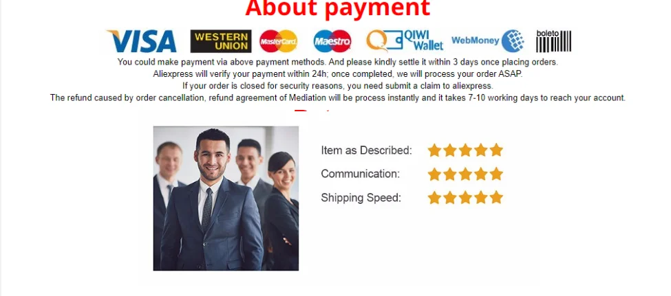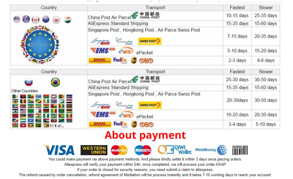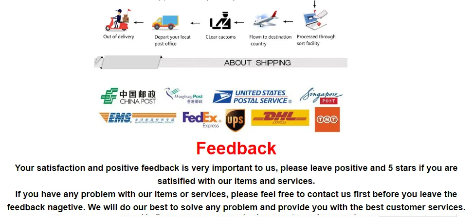 О нас мы обещаем: 1: производство только лучших потребительских товаров и обеспечение самого высокого качества. 2: доставка товаров нашим клиентам по всему миру со скоростью и точностью политика обслуживания клиентов мы с радостью ответим на любые ваши вопросы, пожалуйста, свяжитесь с нами по номеру 1: заказы обрабатываются своевременно после подтверждения оплаты. 2: Мы отправляем только на подтвержденные адреса заказов. Ваш адрес заказа должен соответствовать вашему адресу доставки. 3: Если вы не получили вашу посылку в течение 30 дней с момента оплаты, пожалуйста, свяжитесь с нами. Мы отследим отправку и свяжемся с вами как можно скорее. Наша цель – удовлетворение клиентов! 4: из-за наличия на складе и разницы во времени мы отправим ваш товар с нашего первого доступного склада для быстрой доставки. Наши преимущества 1: Мы все имеем собственный запас, с адекватной поставкой 2: качество продукции достигло серии сертификатов 3: Мы поддерживаем различные транспортировки, почтовые пакеты Гонконга и Китая, EMS.DHL Федеральный. UPS и TNT могут полностью удовлетворить различные потребности покупателя. Я твердо верю, что мы будем вашим лучшим партнером и отзывами. Ваше удовлетворение и положительотзывы в очень важны для нас. Пожалуйста, оставьте положительный отзыв и 5 звезд, если вы довольны нашими товарами и услугами. Если у Вас возникли какие-либо проблемы с нашими товарами или обслуживанием, пожалуйста, свяжитесь с нами, прежде чем оставить отзыв. Мы сделаем все возможное, чтобы решить любую проблему и предоставить Вам лучшее обслуживание клиентов