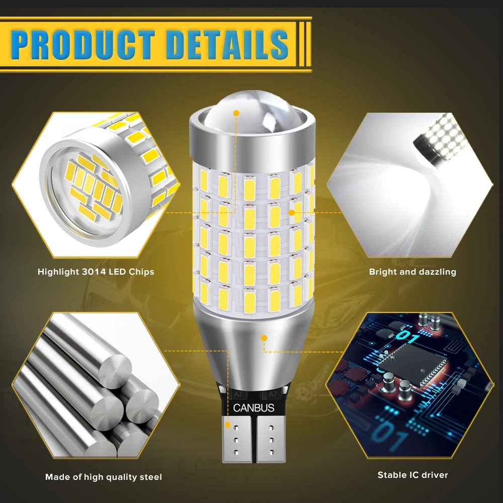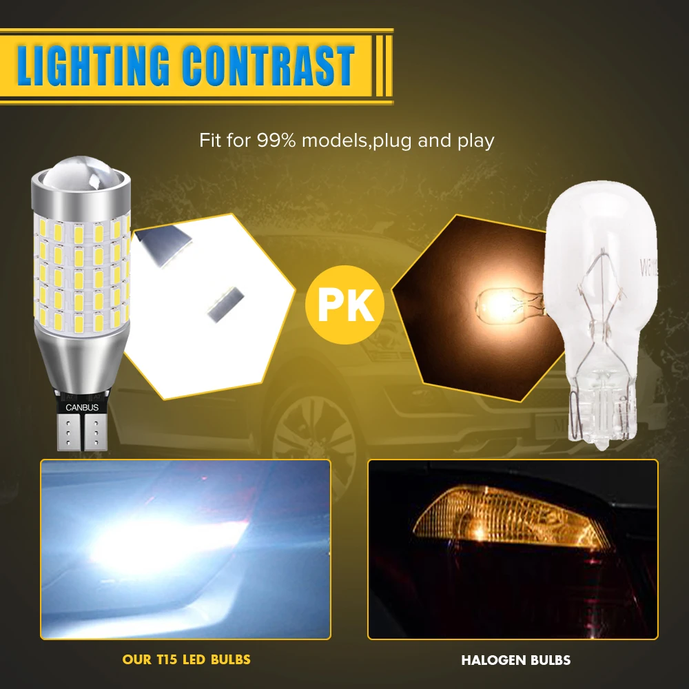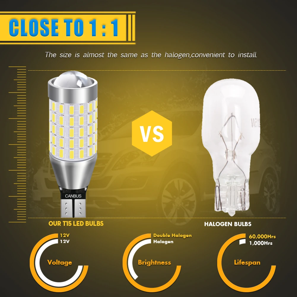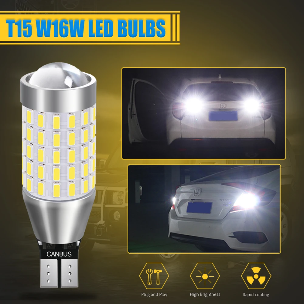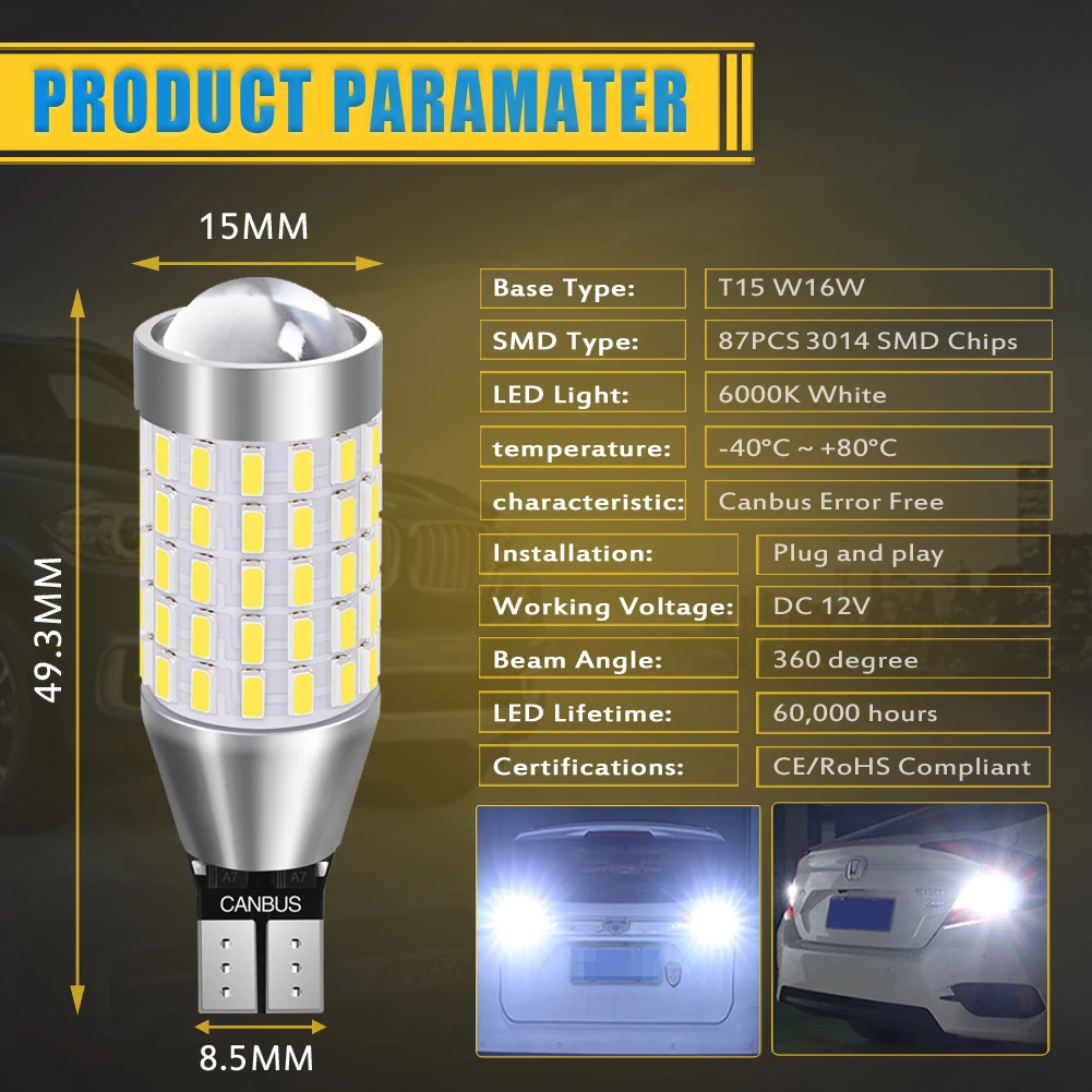 Тип основания: T15 W16W Светодиодный Тип: 3014 SMD (87 светодиодный s количество) Светодиодный Цвет: белый Угол луча: 360 градусов Рабочее напряжение: 12-24 В Цветовая температура: 6000K Светодиодный чип на плате) Срок службы: 60000 часов Тип: светодиодный светильник для замены