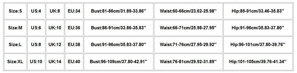 | Размер: S | США: 4 | Великобритания: 8 | ЕС: 34 | Обхват груди: 81-86 см/31,89-33,86 дюйма | Талия: 60-66 см/23,62-25,98 дюйма | Обхват бедер: 85-91 см/33,46-35,83 дюйма |