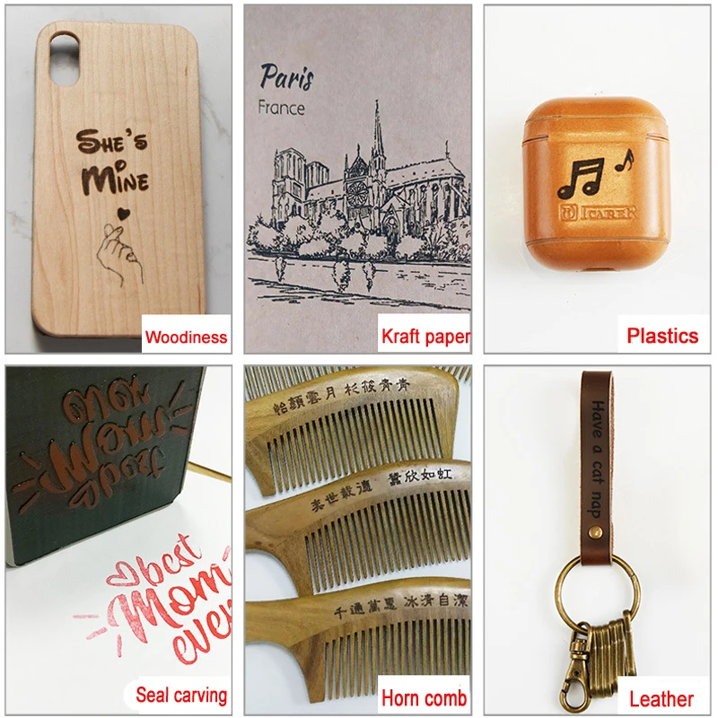 1. Материалы, которые могут быть выгравированы: дерево, бамбук, бумага, пластик, кожа, резина, губка, расческа, кошелек или другой горючий пластик (например, мобильный телефон чехол, мышь, карандаш, визитная карточка, бумажник, пластиковая расческа);