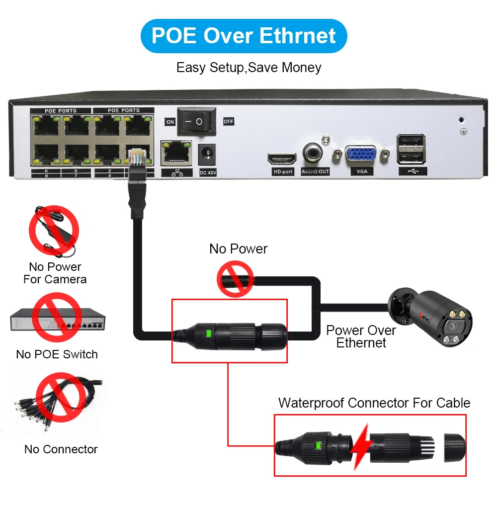 Не нужно дополнительных кабелей питания, адаптеров или переключателей. Подключи и работай, простая настройка. Экономия денег и удобство, коммутатор POE NVR = NVR + POE