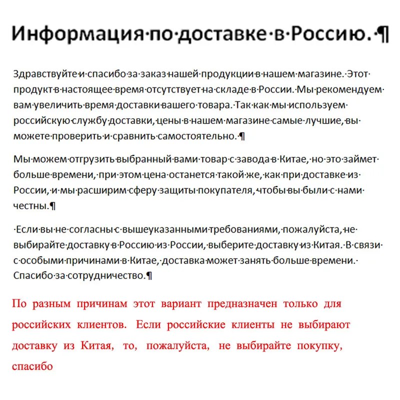 Прежде чем отправить нам товар обратно, пожалуйста, свяжитесь с нами для получения подробной инструкции по возврату и обмену.