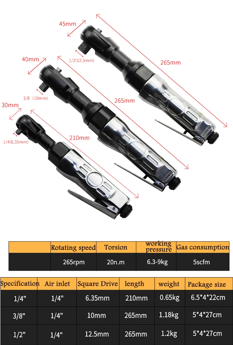 Квадратный привод: 1/4 3/8 1/2 Макс. Крутящий момент: 20 Н. М Вибрация с квадратным носком по уровню поверхности: <0,4 мм Бесплатная Скорость: 265R.P.M Воздушный Давление: 6,3-9 кг/cm2 Длина: 270 мм Особенности:1. Идеально подходит для большинства применений в автомобильной мастерской и подходит для радиатора,