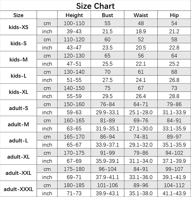 Размер, который подходит:Вы можете увидеть пять размеров для детей от размера для детей-XS до размера для детей-XL и шесть размеров для взрослых от размера для взрослых-S до размера для взрослых-XXXL. Обслуживание на заказ приемлемо, если стандартный размер вам не подходит. Если вы сомневаетесь в выборе размера, пожалуйста, не стесняйтесь спросить об этом, мы ответим вам в первый раз.