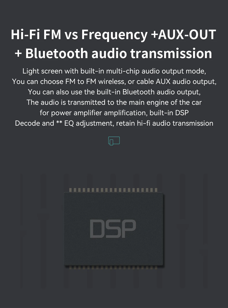 8) звук работает синхронизацией того же fm-радио канала, что и автомобильное fm-радио или AUX кабельным подключением