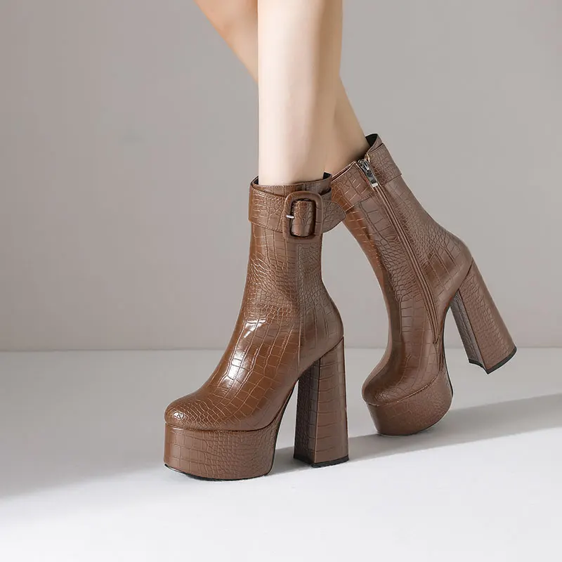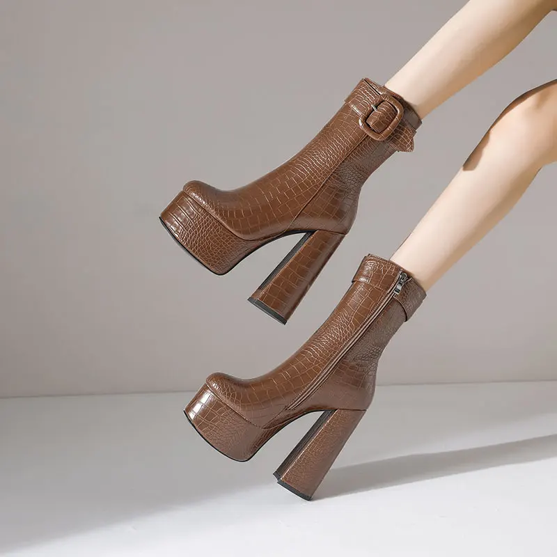 Sgesvier/женские ботильоны на очень высоком квадратном каблуке 14 см; Женские полусапожки из искусственной кожи; Цвет черный, коричневый; Пикантная женская обувь