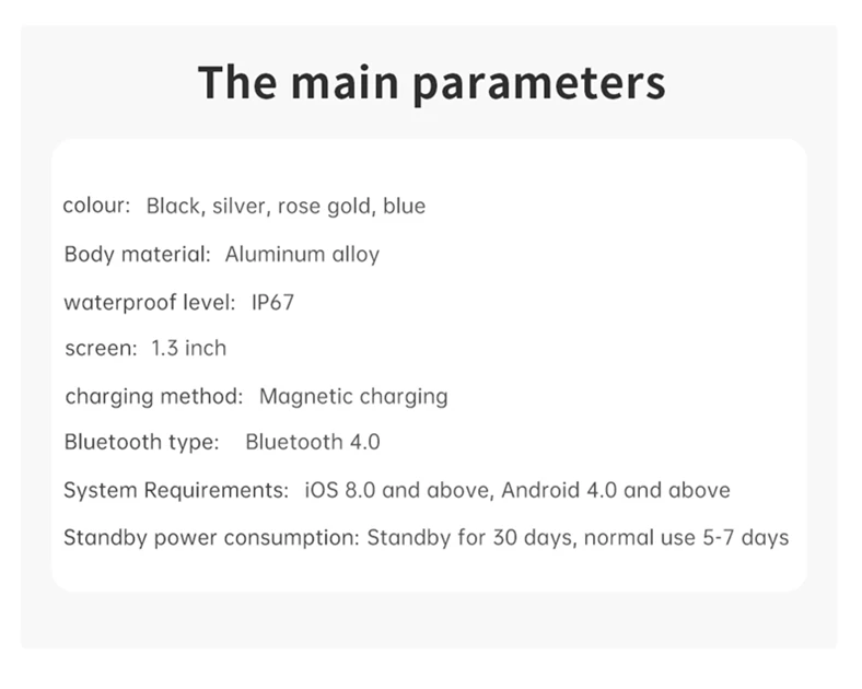 3.Persistent battery life and fast charging: Smart watch built-in low-power Bluetooth chip, sensor and rechargeable battery. Magnetic charging cable, charging time is about 3 hours, normal working 10~15 days, standby for 30 days.