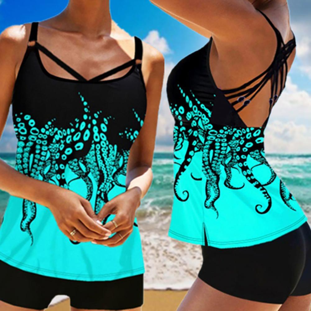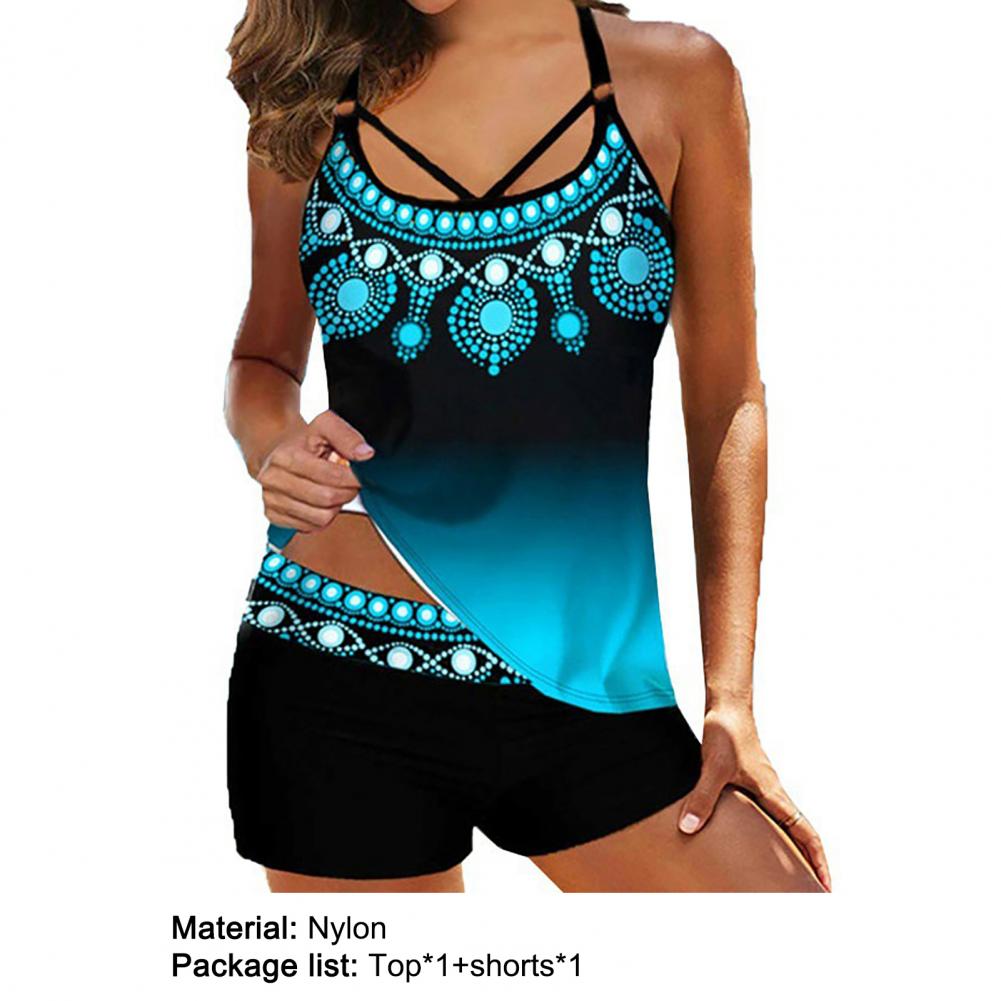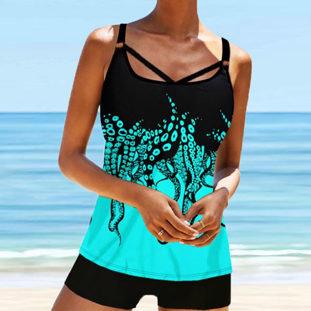 Женский купальник с голубым принтом, Свободный Подол, комплект из двух предметов, топ с подбивкой на животе, шорты для мальчиков, купальный костюм, купальный костюм
