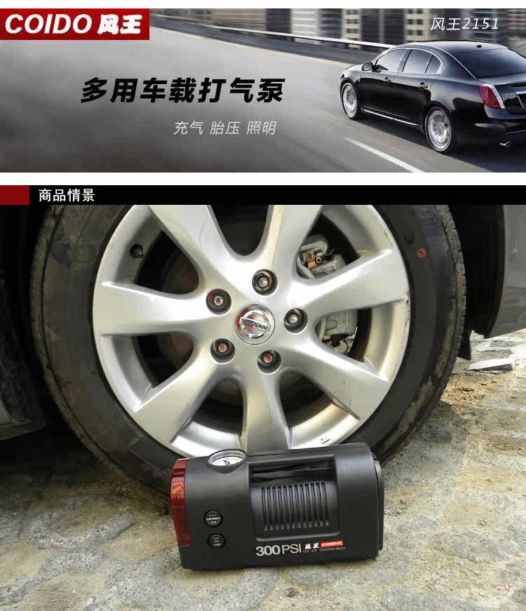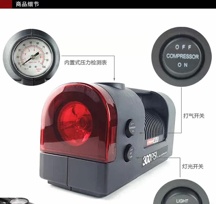 COIDO 2151 утилита для транспортного средства используется воздушный компрессор с мини-дизайном формы, мощный, оснащенный встроенный индикатор обнаружения давления в шинах для измерения давления в шинах, помочь вам в обнаружении ситуации с давлением в шинах в любое время и в любом месте, а также с автомобильным напряжением постоянного тока 12 В, максимальное давление надувания составляет 300psi (Нормальная шина может оставаться 220PSI), подходит для шин транспортных средств, мотоциклов, велосипедов и мячей, надувных резиновых лодок и т. д. Это не занимает пространство багажника. Есть ночные огни и стробоскопические сигнальные огни. Это имеет цель экстренной помощи, пока шины протекают на дороге, дороге или шоссе на открытом воздухе. Между тем он идет с разного размера гнезда клапана шины для надувания шин, резиновых лодок, шариковых игр, действительно необходимо иметь такой хороший помощник для вашего автомобиля.