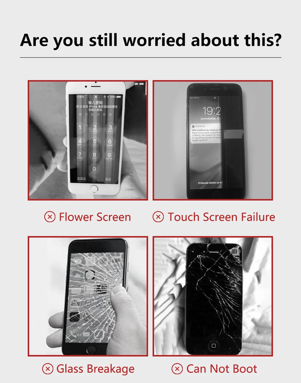 1. Внешнее стекло + сенсорный дигитайзер + ЖК-экран + средняя рамка + держатель передней камеры (без фронтальной камеры) + держатель датчика + Ушная сетка, сборка, сменный дигитайзер и сенсорный ЖК-экран в сборе для iPhone 4/4S/5S/SE/6/6s/6 Plus/6s Plus/7/7 Plus/8/8 Plus/X/XR/Xs/Xs Max 2. Замена и ремонт вашего старого, сломанного, треснутого, неправильного цвета проблемы ЖК-дисплея 3. Прямая поставка с фабрики, большое количество в наличии 4. Каждый товар тестируется 3 раза, чтобы убедиться, что все в хорошем состоянии перед отправкой, 100% абсолютно новый 5. Упаковано хорошо и безопасно, мешок пузыря + коробка пены для упаковки 6. Доставка вашего заказа в течение 12 рабочих часов после подтверждения оплаты 7. Срок службы гарантии, любой дефект, мы вернем или повторно отправим, за исключением причиненного человеком повреждения 8. Утонченная продажа после-обслуживания, приобретайте его с уверенностью