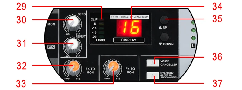Если переключатель выключения звука FX нажат, канал эффектов приглушен, т. Е. Нет сигнала на разъеме FX SEND, и процессор эффектов больше не приемником и входным сигналом.