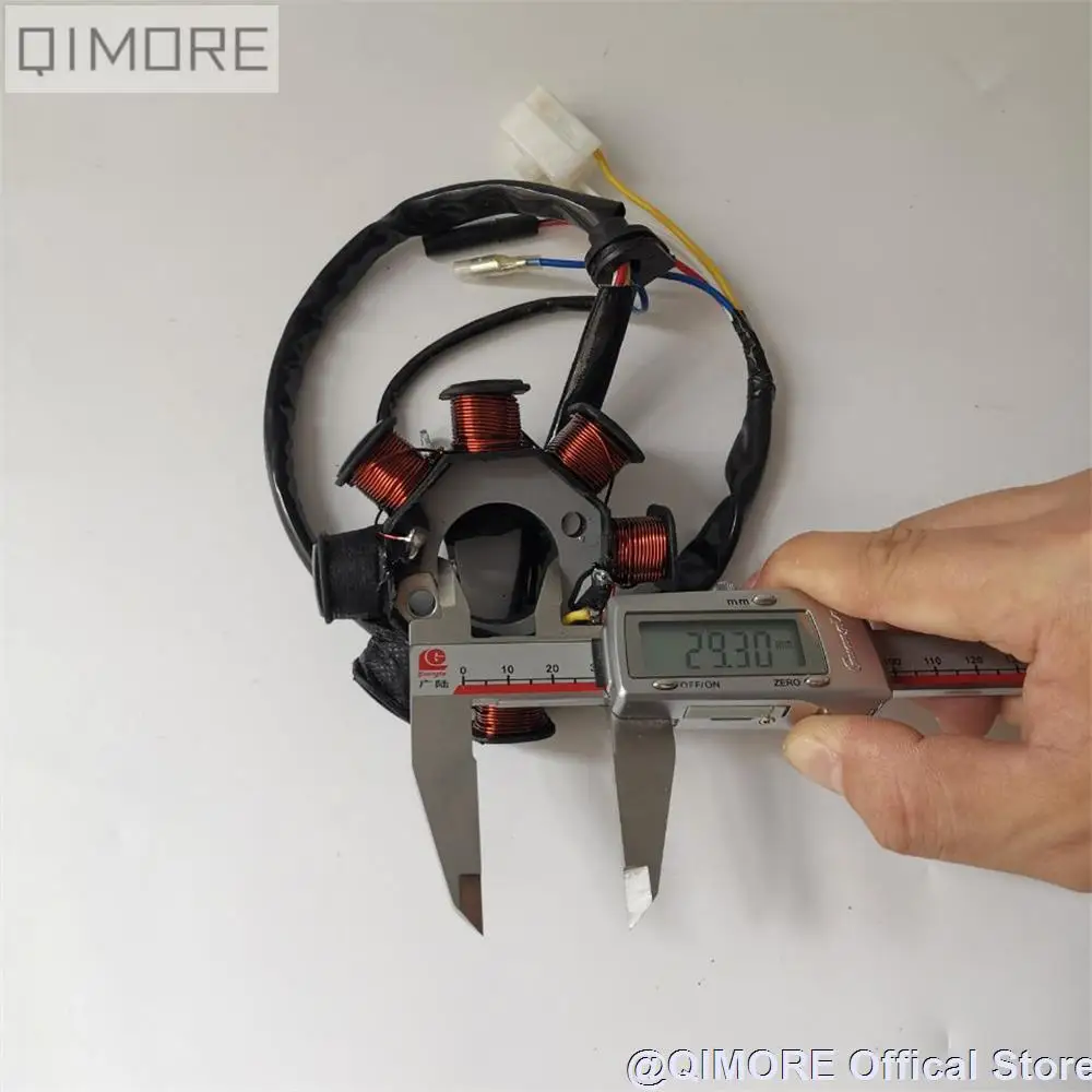 Внешний диаметр: прибл. 88 мм Внутренний диаметр отверстия: 29,3 мм Расстояние между центром монтажного отверстия: 42 мм Толщина: прибл. 25 мм Перед заказом проверьте проводку вашего старого статора. Этот статора имеет один 3-контактный с разъемом «папа» с 2 проводами б/у (желтый, белый), а также два раздельных провода (один синий/белый провод черно-красные провода). Применение: 139QMB GY6-50 GY6--60 GY6-80 cc 4 тактный скутеры/ATV/GO KART