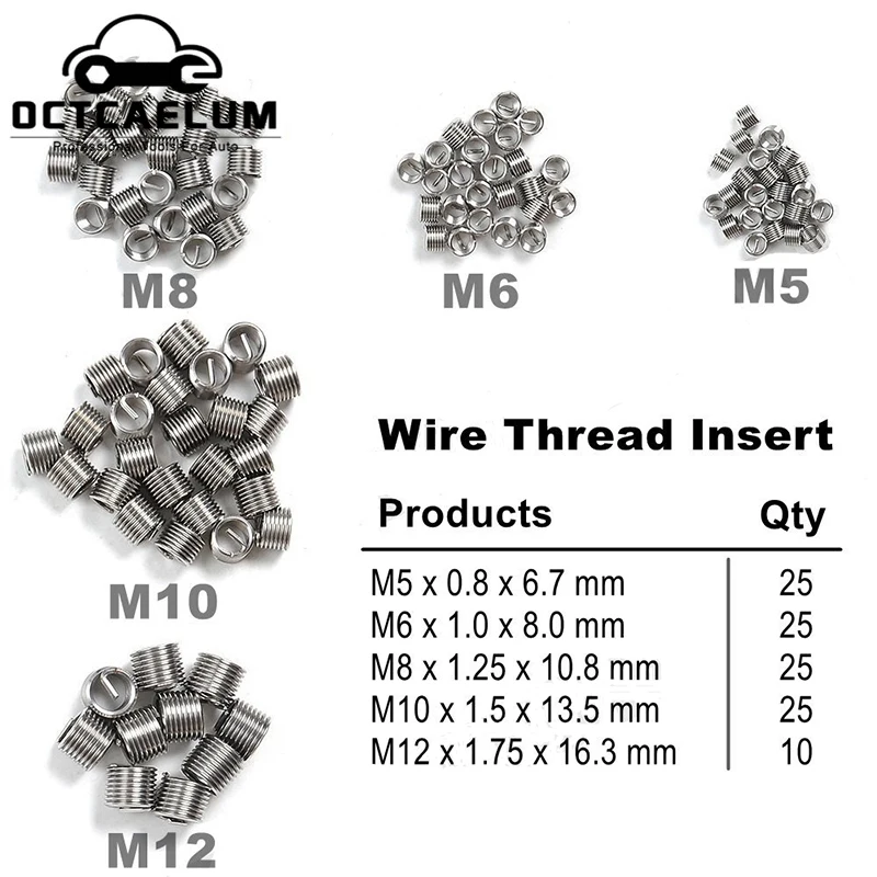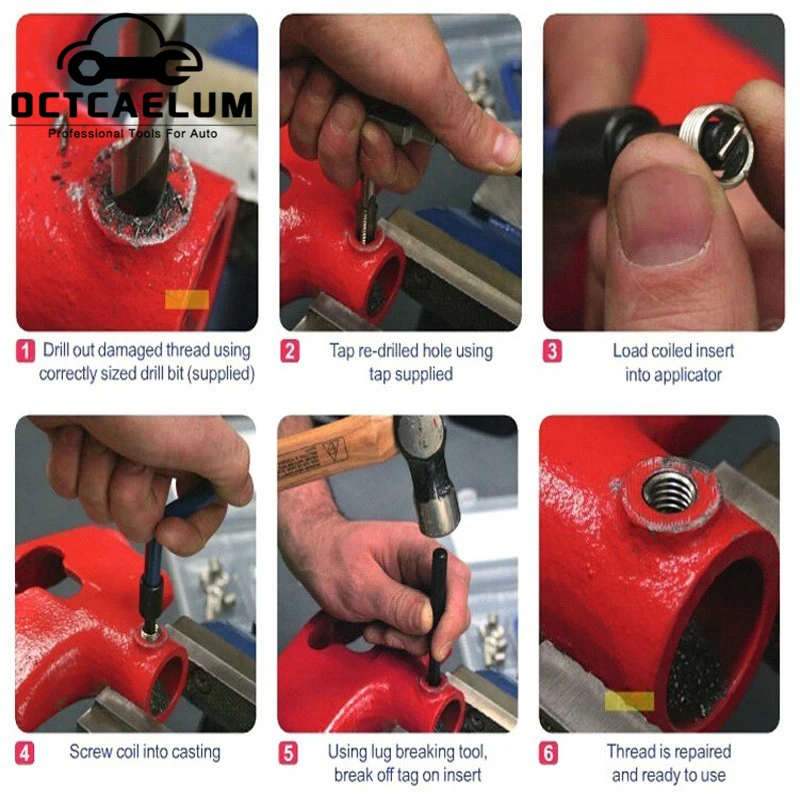 Изготовлен из хромированной ванадиевой стали для прочности и долговечности. Идеально подходит для восстановления поврежденных нитей из стали, чугуна и алюминия. Подходит для ремонта двигателя и других автомобильных применений. Сверление-Очистите поврежденные нити стандартным сверлом. (Для ремонта резьбы свечи зажигания не требуется предварительное сверление при использовании специального крана свечи зажигания), пожалуйста, обратите внимание, что для меток fluteless требуются большие отверстия. Проверьте, соответствует ли резьба и шаг крана и болта Постукивание-Используйте специальные краны для резки удерживающей нити в очищенное отверстие (рекомендуется использовать подходящее режущее масло) Установите вставную вставку на установочный инструмент и расположите регулируемое кольцо так, чтобы вставка tang была центрирована в слоте tang. Вставьте светильник под давлением вниз до полуповорота под поверхностью. Не работает против направления резьбы, так как Тан может сломать. Удаление Tang-после окончания Поднимите инструмент установки и используйте инструмент для снятия tang break. Для больших размеров и нажатий свечей зажигания Используйте длинные плоскогубцы для удаления tang. Из-за узких и точных допусков новая нить обычно прочнее, чем оригинальная.