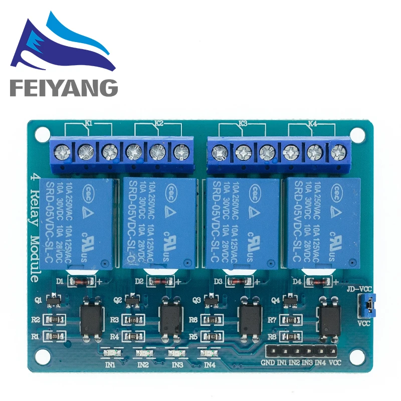 4-Канальный Релейный выход модуля, релейный выход Контакты 250A 10A. Вход в 1, IN2, IN3, IN4, сигнальная линия низкая эффективность. VCC, GND вход питания, может релейный отдельный источник питания реле ввода питания JD-VCC. Использование: 1, поддержка всех MCU управления. 2, промышленный сектор; 3, PLC контроль; 4, умный дом контроль;