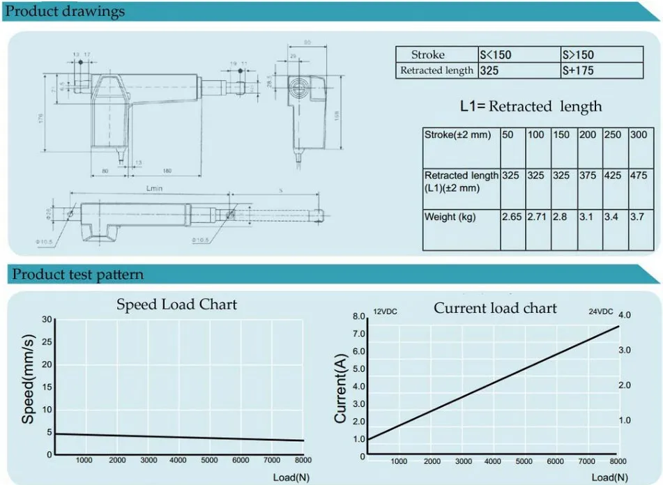 Мы будем поставкой по умолчанию24v 250 мм 8000N 5 мм/сек.Линейный привод