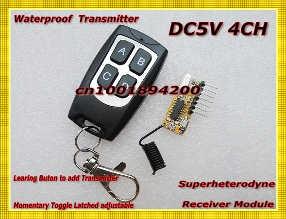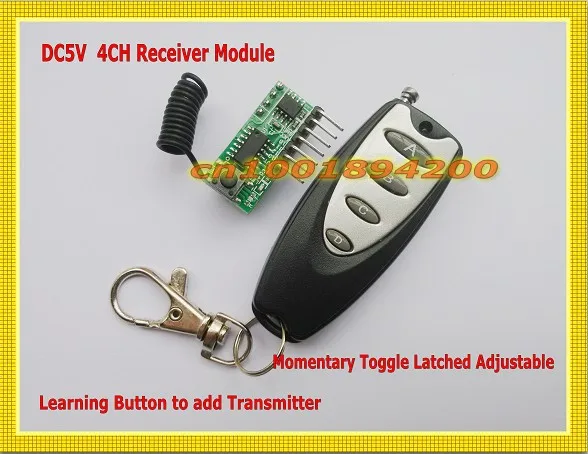 Мини размер супер-гетеродинный декодирование 4CH модуль приемника Рабочее напряжение: DC3V-5V (лучший DC5V) Размер: 30*12*8 мм Рабочая частота:315/433. 92 МГц опционально Рабочий ток: ≤ 3 мА (5,0 В постоянного тока) Режим модуляции: Чувствительность запроса:-105dBm (50Ω) Удаленное Расстояние: 10-100 метров (открытое пространство) Выходные данные: 4-канальный высокоуровневый сигнал TTL Тип кодирования: кнопка обучения для добавления передатчика Режим работы: мгновенное переключение с фиксацией регулируетсяPin No. Pin Name инструкция1 индикация выходного состояния VTВыход данных 2 D3 C выход данных4 B выход данных5 A Выход данных6 5 В мощность +Мощность 7 GND-Мгновенный. Переключение. Фиксация регулируется точкой на приемнике.Мгновенный ------------ нажмите кнопку передатчика A, реле приемника A Включено, отпустите кнопку A; реле приемника A выключено, то же, что и B/C/DПереключение ------------------ нажмите кнопку передатчика A 1 раз, реле приемника A Включено, нажмите кнопку A снова, реле приемника A выключено, то же, что и B/C/D.Защелкивается --------------------Нажмите кнопку передатчика A, реле приемника A Включено, реле B/C/D выключено.Нажмите кнопку передатчика B, реле приемника B включено, реле A/C/D выключено.Нажмите кнопку передатчика C, реле приемника C включено, реле A/B/D выключеноНажмите кнопку передатчика D, реле приемника D включено, реле A/B/C выключено.Это также означает. Запирается только на 1CH. И у него часто будет 1CH.