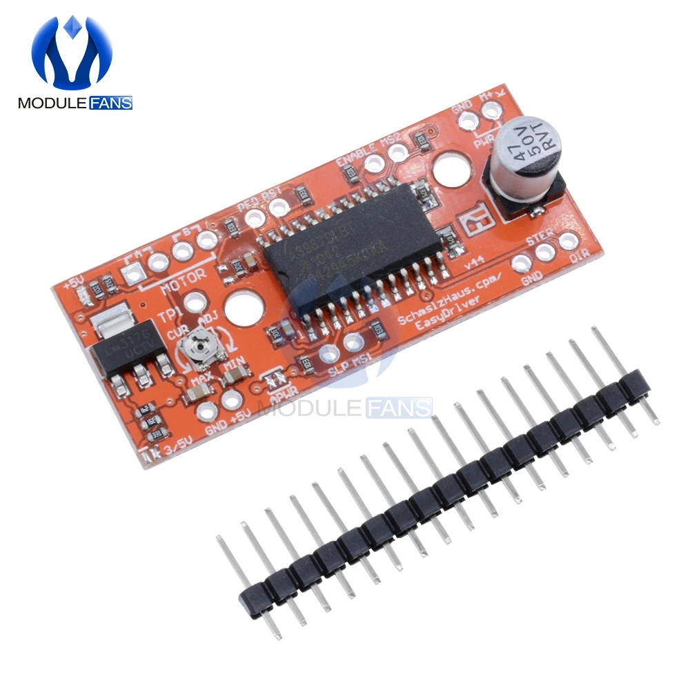 В EasyDriver является простым в использовании Драйвер шагового двигателя, совместимый с чем-то, что может выдавать цифровой 0 до 5V импульса (или 0 до 3,3 V пульс в том случае, если вы припоя SJ2 закрывается на EasyDriver). EasyDriver требует от 7 в до 30 В питания двигателя и может питать любое напряжение шагового двигателя. В EasyDriver имеет на борту регулятор напряжения для цифровой интерфейс, который может быть установлен на 5V или 3,3 V. Подключите 4-проводной шаговый двигатель и микроконтроллер, и вы получите точность управления двигателем! EasyDriver диски Би-полярные двигатели, и моторы проводной как би-полярный. Т. Е. 4,6 или 8 проводных шаговых двигателей. В этой версии (v4.4) мы зафиксировали шелковую погрешность при минимальной/максимальной регулировке.